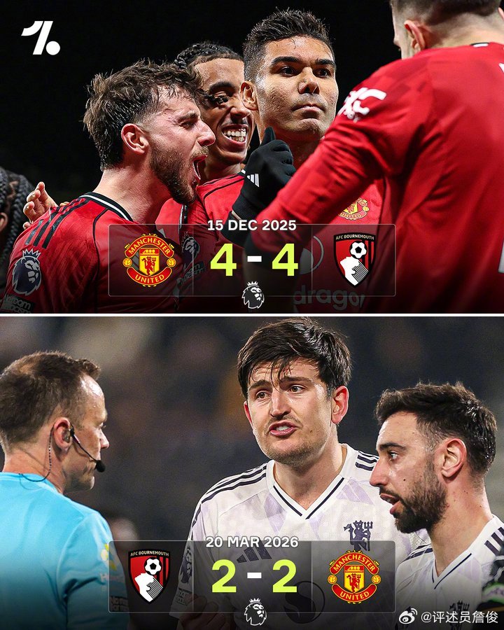 这个赛季曼联两次战平伯恩茅斯。首循环交锋在主场三次领先没拿下,这次是两次领先最后只收获一分还付出马奎尔红牌的代价。下半场阿玛德禁区内倒地没有得到点球是一个转折点,25秒后“樱桃军团”扳平比分。个人觉得曼联还是不应该在上半场浪费那么多机会,这段时间姆伯莫和阿玛德状态一般,可以让舍什科先发的。另外就是卡塞米罗体能下滑比较快,B费最后都跑不动了,卡里克对替补球员信心不足不敢太早调度。下半场中段开始伯恩茅斯的正面进攻太轻松了。