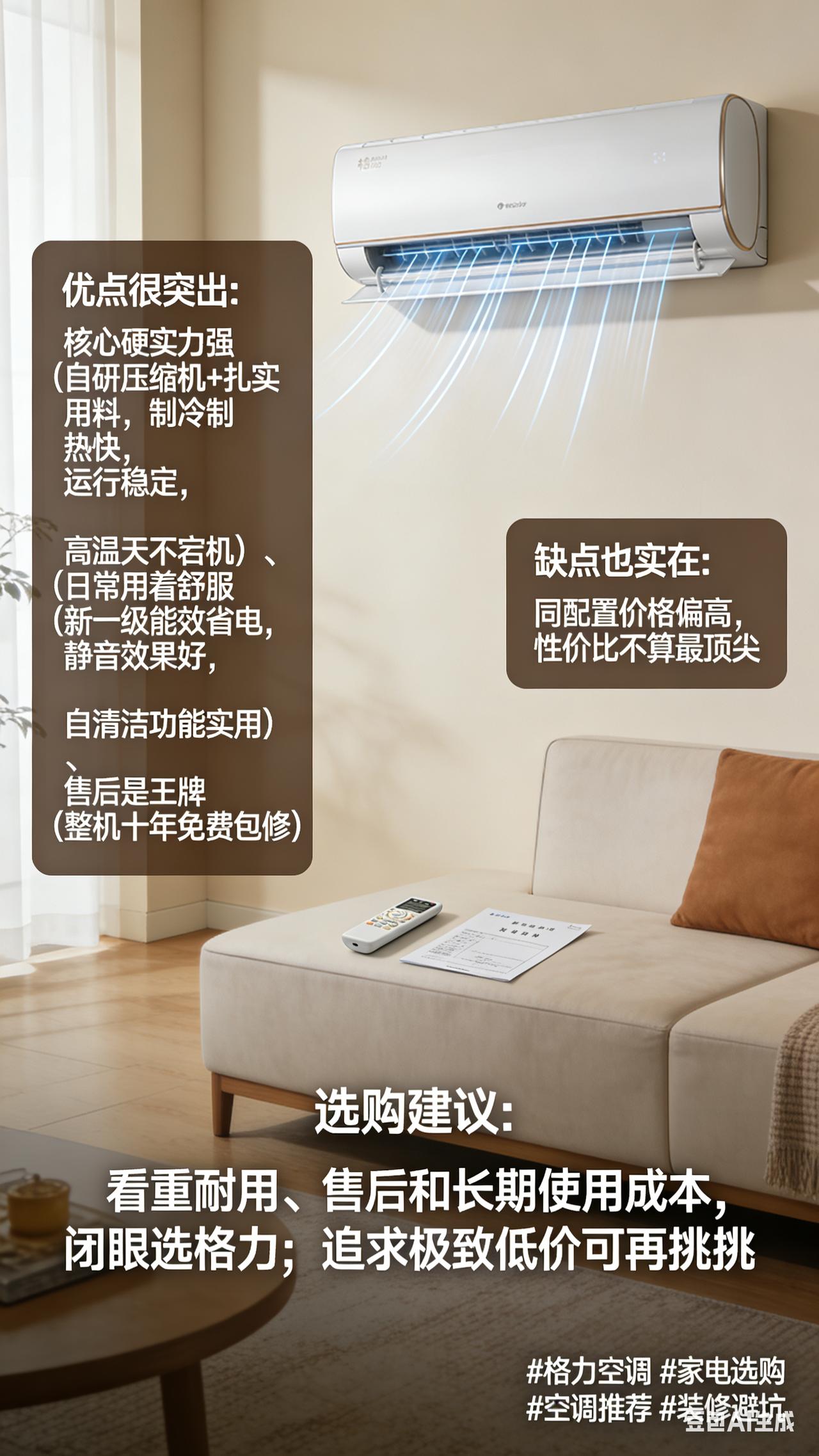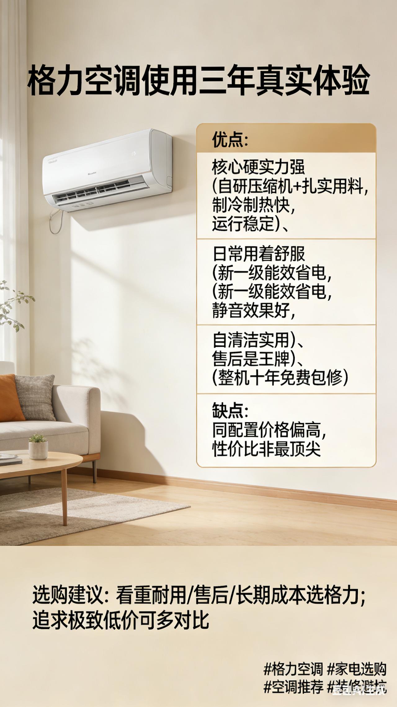 格力空调到底好不好?用了三年,说说大实话 🤔 家里的格力挂机用了三年,今年夏天40℃高温天,制冷依然很给力,没有掉链子💪 ✅ 优点很突出: · 核心硬实力强:自研压缩机+扎实用料,制冷制热快,运行稳定,高温天也不宕机 · 日常用着舒服:新一级能效省电,静音效果好,自清洁功能也很实用 · 售后是王牌:整机十年免费包修,这个标准业内真没几家能做到。给爸妈房间装的就是格力,图的就是个省心 ⚠️ 缺点也实在: 同配置价格确实偏高,性价比不算最顶尖。如果预算卡得紧,可以多对比几家 🎯 选购建议: 看重耐用、售后和长期使用成本,闭眼选格力;追求极致低价的话,可以再挑挑 你家用的什么空调?来评论区聊聊体验👇(个人观点,仅供参考) 格力空调 家电选购 空调推荐