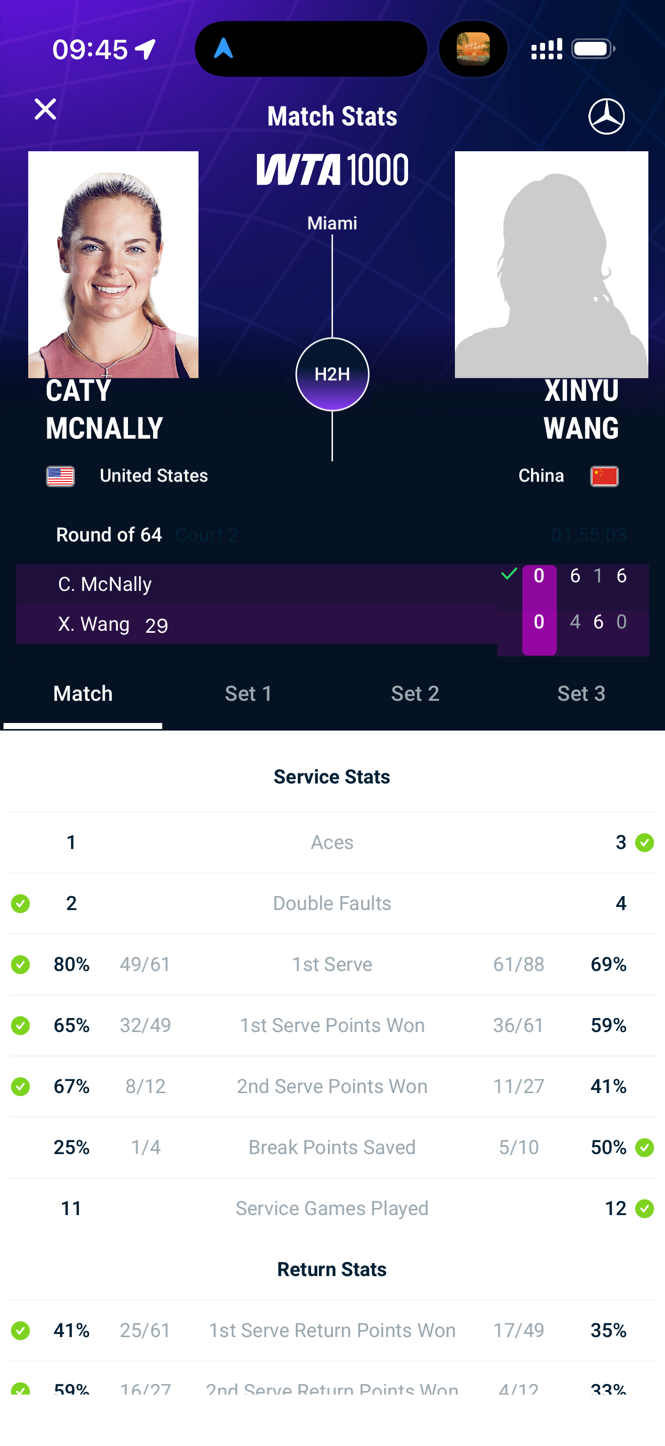 迈阿密站第二轮,麦克纳莉以6-41-66-0淘汰29号种子王欣瑜,成功晋级第