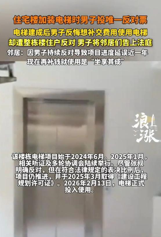 想得美!广东广州,老旧小区没有电梯,上下楼特别不方便,所以大家协商,每家拿出1.9万元加装电梯,整栋楼都举双手赞成,唯独一大爷站出来反对,说装了电梯影响他家采光和隐私,因为他的反对,工期整整耽误了一年多,谁知,等电梯安装好之后,大爷又满眼羡慕,说他愿意补钱使用电梯,哪有这么美的事,其他业主都不同意,大爷竟一气之下将楼上十几家邻居全都告上了法庭。 广州一栋老旧居民楼,为了一部电梯,邻里之间上演了一出“反转再反转”的大戏。 这栋楼因为没有电梯,高层的住户每天爬楼梯爬得苦不堪言,于是大家商量着集资加装,每家掏1.9万元,虽说不是小数目,但一想到以后能一键上下楼,全楼上下几乎都点了头。 唯独住在这儿的一位大爷,态度极其坚决:不同意,他的理由是,电梯装好之后,肯定要影响家里的采光和隐私,就因为他一个人反对,整个工程被硬生生卡了一年多,不管邻居们怎么劝,大爷就是咬死不放。 后来或许是耗不过大多数人的坚持,工程终究还是推进了,那些当初举双手赞成的邻居们如愿以偿,每天坐着电梯进进出出,别提多方便了。 这时候,大爷站在自家门口,看着别人轻松上下楼,心态慢慢起了变化,每天看着那部亮堂堂的电梯,他大概是越看越觉得——这东西好像真不错。 他找到邻居们,话风变了,说自己愿意补钱,也想用电梯,邻居们一听就炸了锅:当初你死活不让装,大家多爬了一年多的楼,现在装好了你想坐就坐?哪有这么美的事。 被拒绝的大爷觉得自己占了理,一纸诉状把楼上十几户邻居全告了。 这官司打到法院,其实已经不是邻里间的怄气了,而是法律层面的较量,法院最后判定,大爷虽然当初反对,但这电梯属于建筑物的共有部分,作为业主,他确实有使用的权利,前提是,他得按当初的标准补交集资款。 这一判,邻居们更是气不打一处来,但法律就是法律。 这事儿说到底,大爷当初为自家的采光和隐私担忧,是人之常情;邻居们想改善出行条件,也是生活刚需,矛盾出在,当个人利益和集体利益冲突时,究竟该怎么平衡,大爷用了一年多的工期,证明了他反对的决心;又用一张诉状,证明了他后悔的坚决。 赢了官司,输了人情,楼道里再碰面,那句“您坐电梯啊”的招呼,恐怕很难再说出口,电梯能载人,但载不动这积攒了一年多的心结。