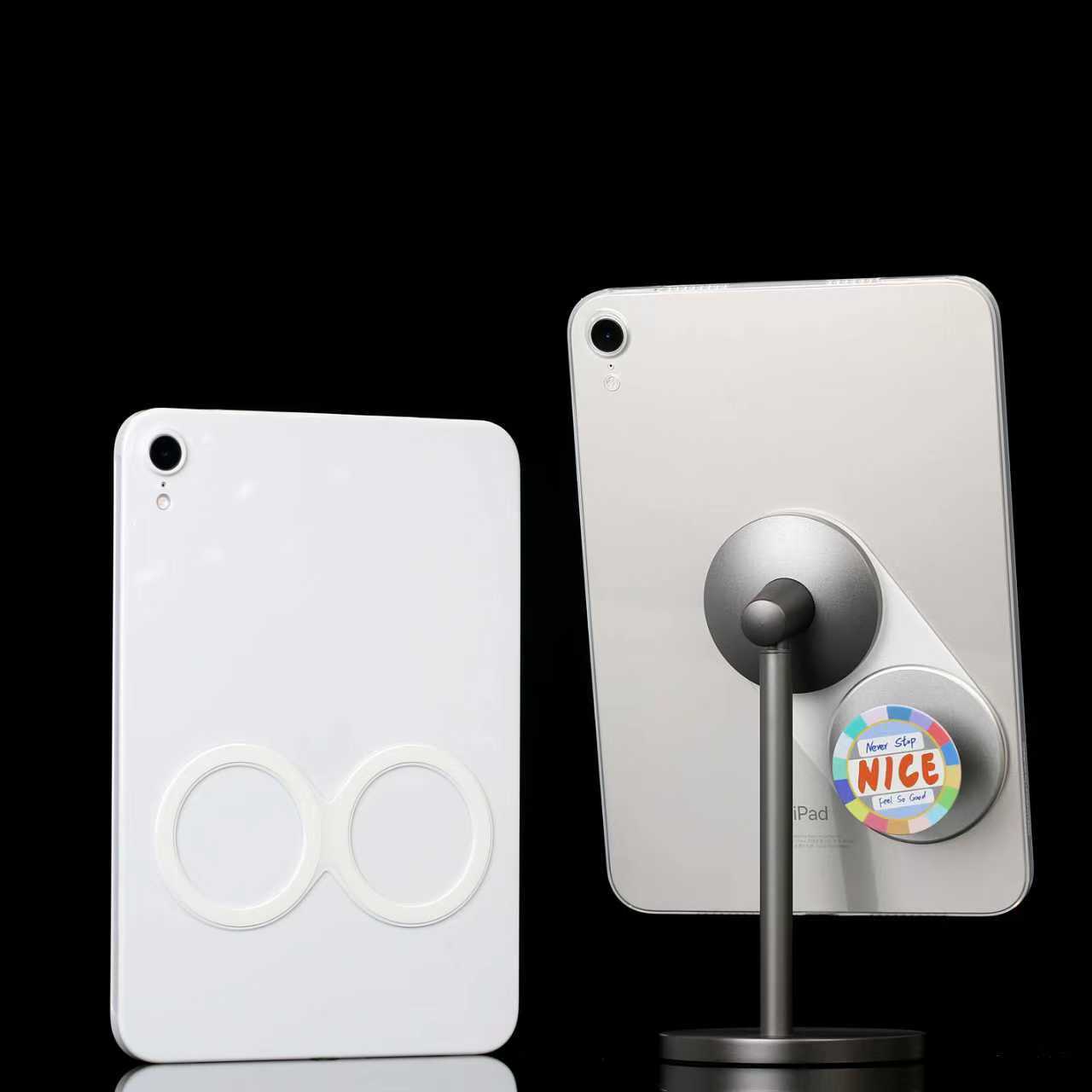 双磁环一贴,轻松把壳子变成双磁圈磁吸壳,吸附不同磁吸配件更方便实用如果要磁力更强的,贴在大平板上,也可以贴两个平板款引磁片,但也会重一丢丢。这两种引磁片搭配旗舰款磁吸头,吸盘真空负压吸附都很稳