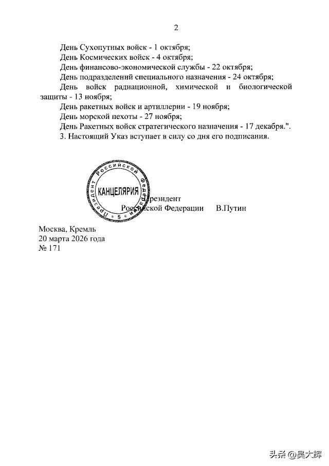 普京签署总统令,在俄罗斯武装力量中设立军事政治机关日。
