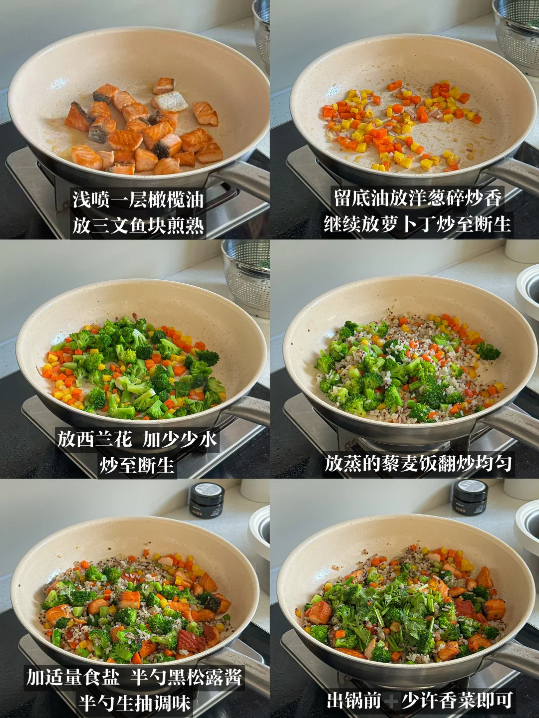最近疯狂迷上这一碗绿色炒饭🥣 外焦里嫩的煎三文鱼块 越嚼越香🤤 多多的西兰花🥦给足清新脆爽 红黄胡萝卜丁点缀出自然的甜味: 一口下去还带一丝黑松露的诱人香气 超满足~ 三色藜麦饭自带微微坚果香和颗粒感 比普通米饭更有“咔吱”的咀嚼快乐~ 还是低GI优质碳水 富含膳食纤维和多种微量元素 一锅搞定 干净又满足 谁吃谁真香🔥 美味一锅出hin适合减脂期!