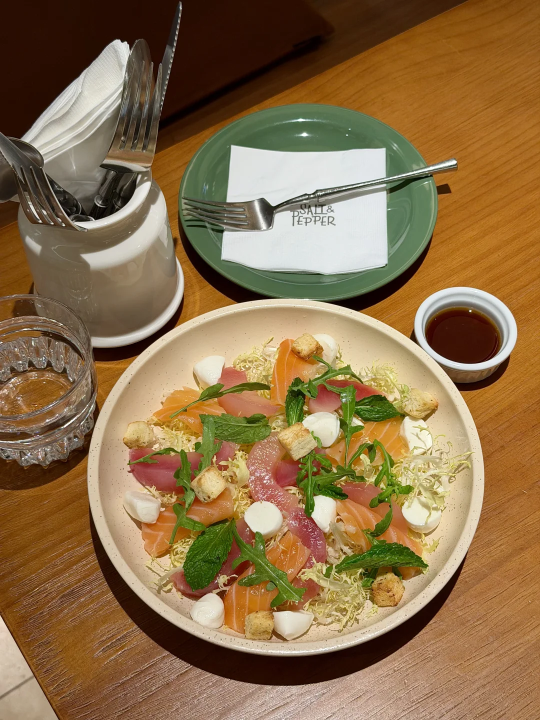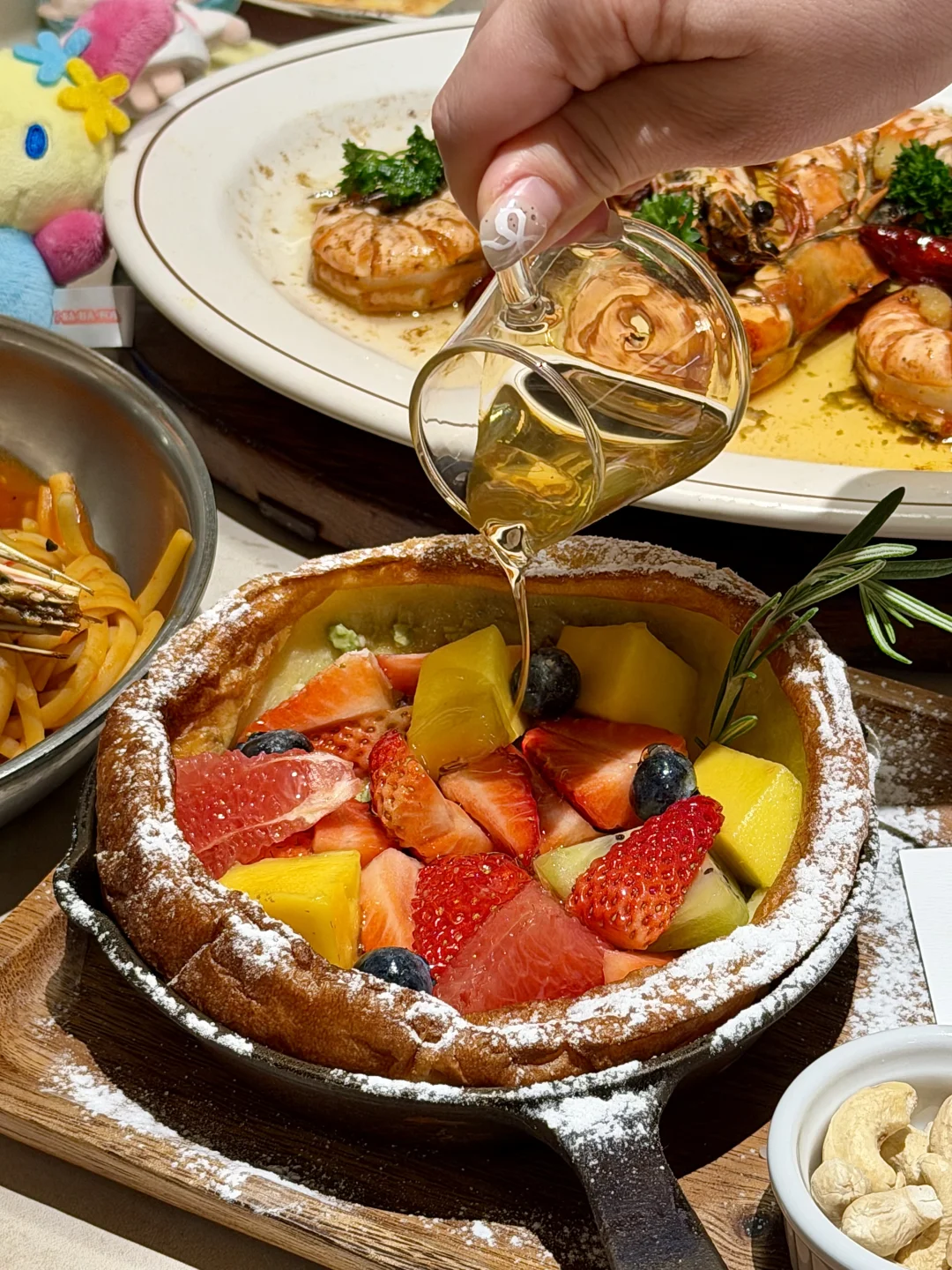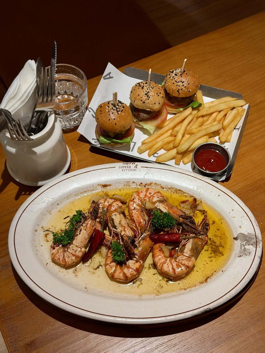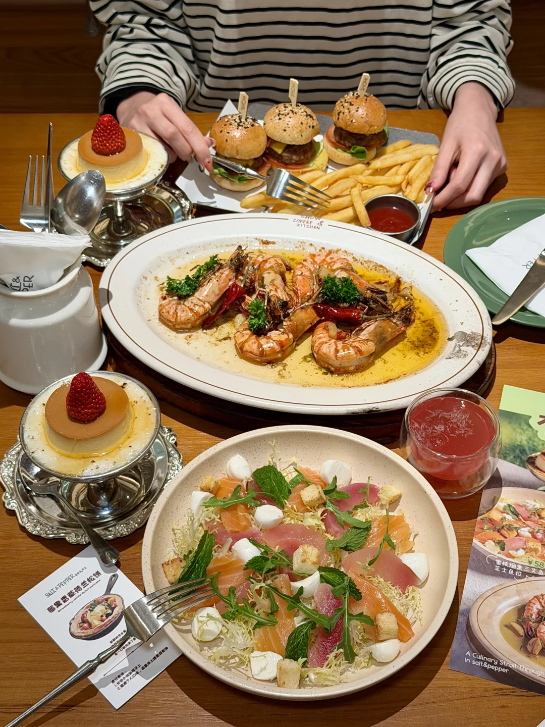 很适合跟闺蜜一起来吃的漂亮饭!就在北城天街4楼上,环境真的很有春日氛围🍃! 我们四个人点了6道菜,没有踩雷的😭😭!墙裂推荐蒜香味的炙烤黑虎虾+韩式辣酱味的阿根廷红虾意面,品质真的很不错!!沙拉跟松饼都很好看,搭配饮品果感康普茶很清爽解腻!很适合拍照📷!是近期吃得最舒服的一顿🥹🥹!!!