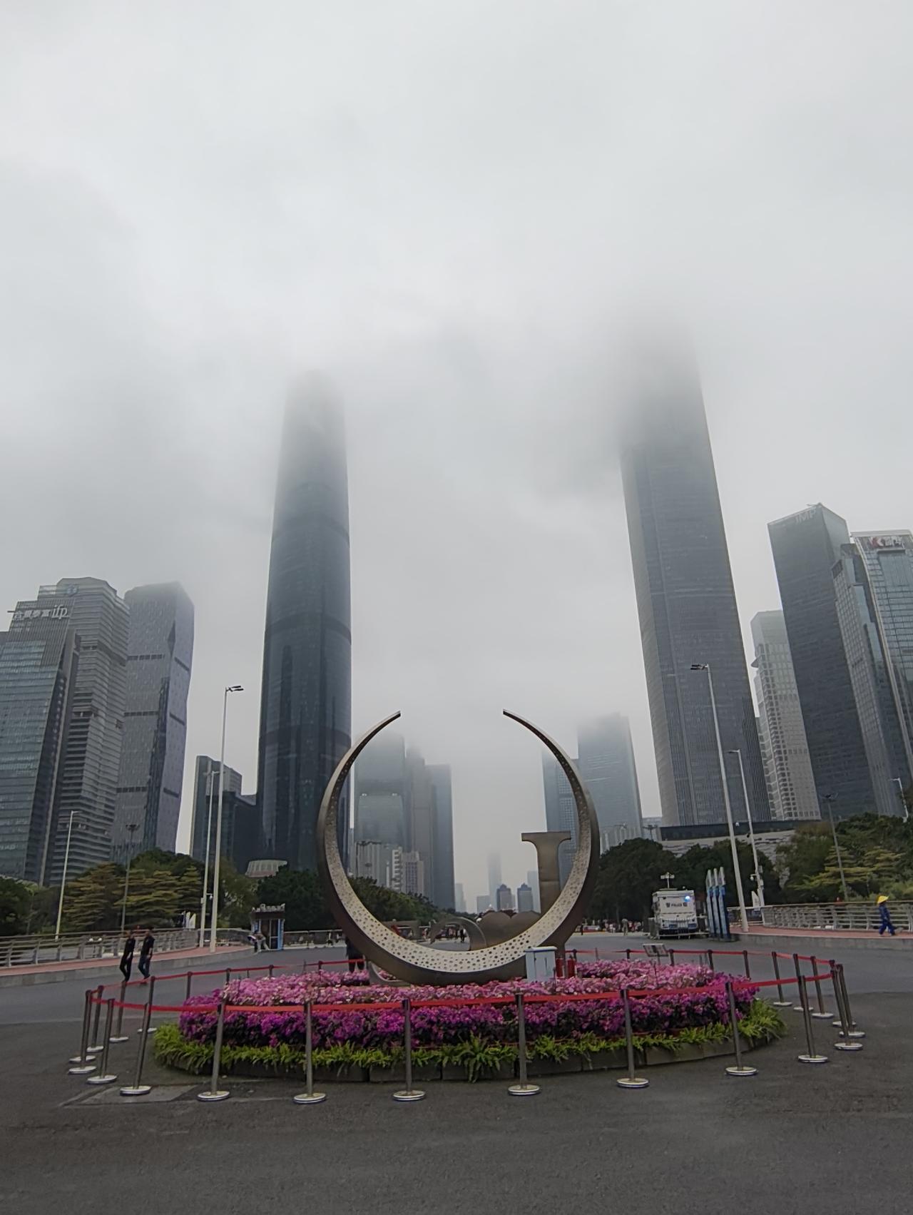 今天烟雨蒙蒙,消失不见的广州塔顶,花城广场的花很漂亮啊!天气不好,不冷不热
