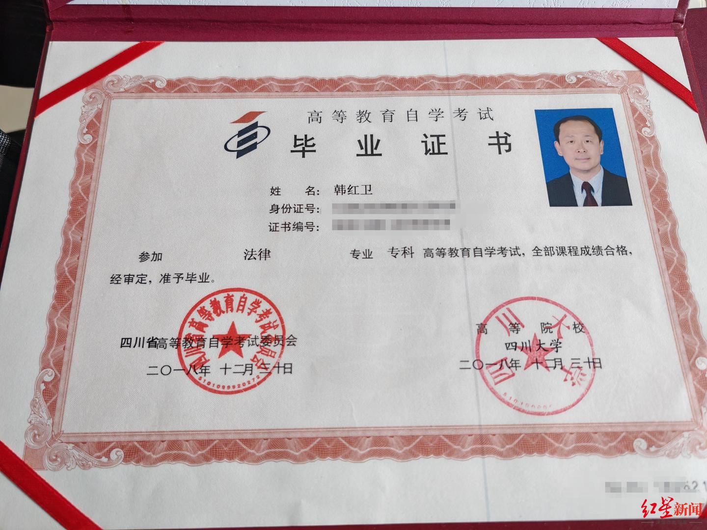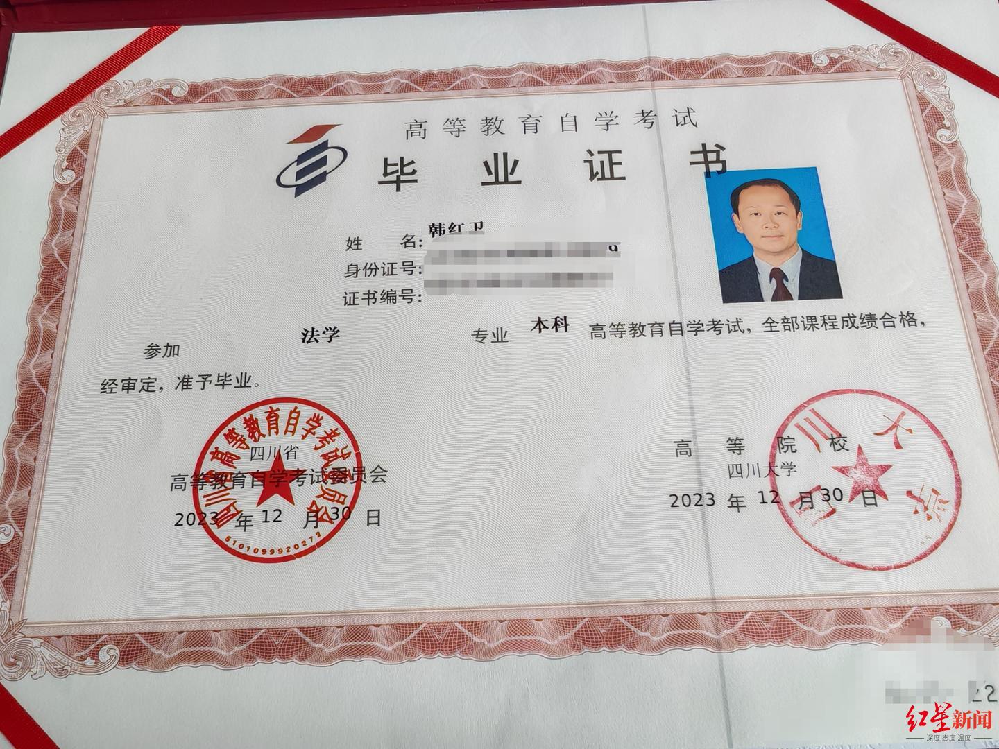 ▲韩红卫自考取得四川大学法学本科毕业证书