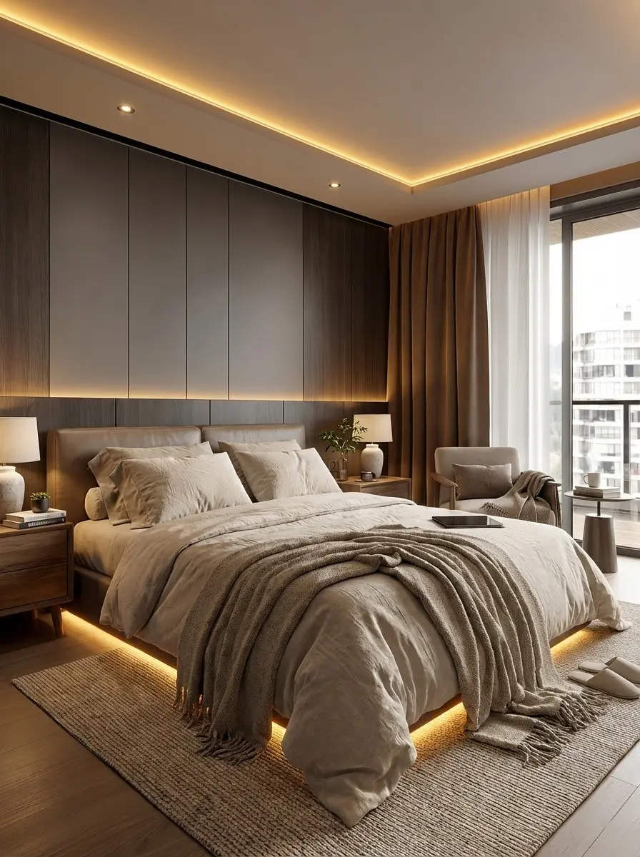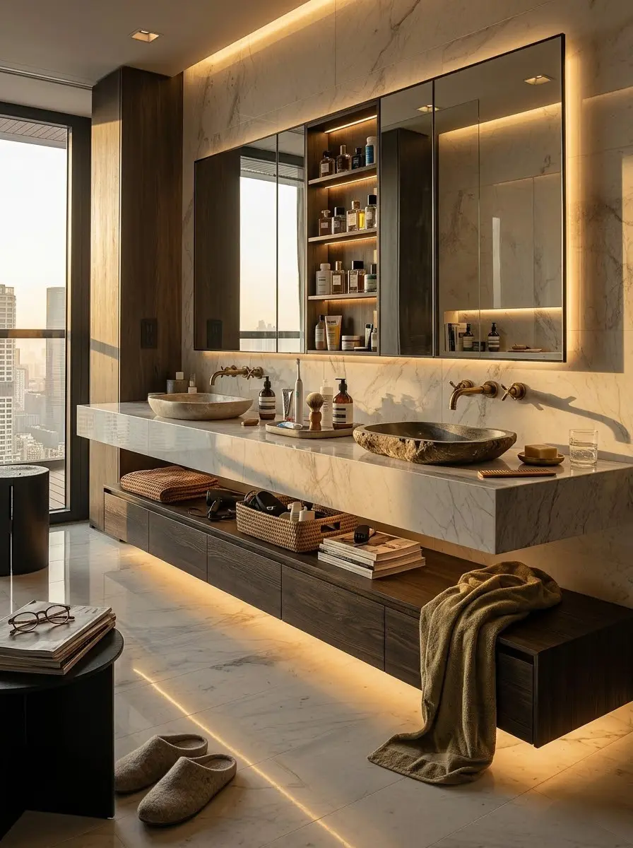 卧室延续了整体的温润调性,木饰面与硬包背景墙层次分明,悬浮床搭配暖光地脚灯,既保证了私密性,又营造出治愈的睡眠氛围。双台盆卫生间采用大理石台面与智能镜柜,通透又实用,让日常洗漱也充满仪式感。