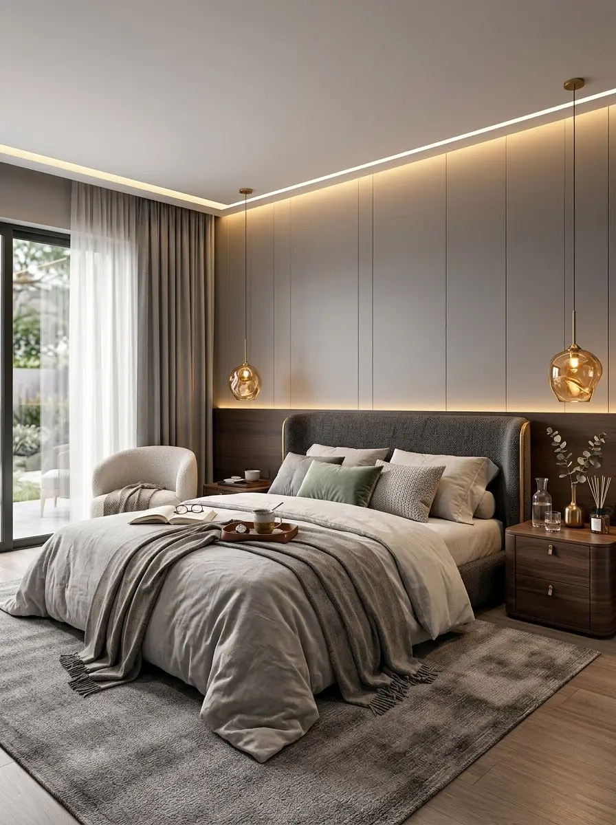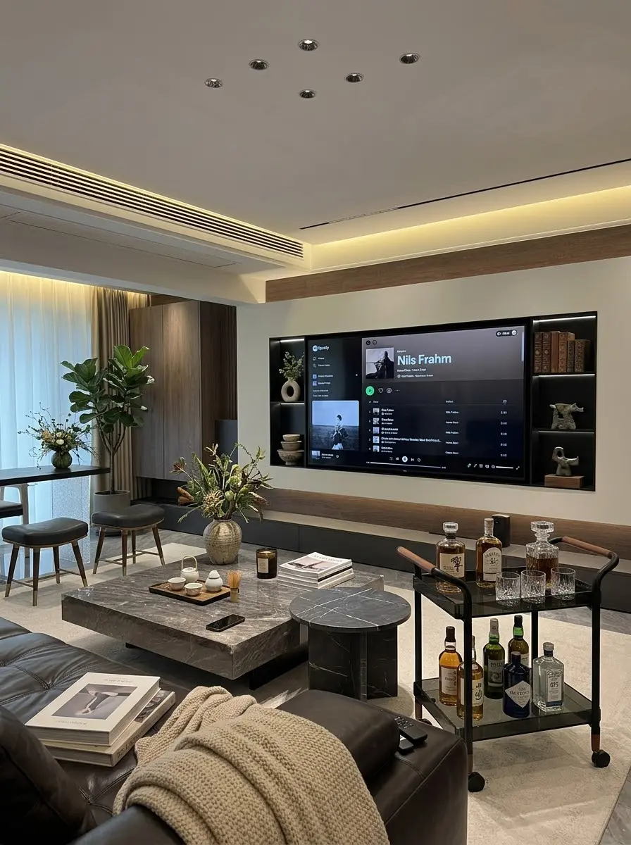 全屋以低饱和灰 + 暖木色为基调,摒弃繁杂装饰,让空间回归本真。客厅里,悬浮式电视柜与无主灯设计相得益彰,线性灯带与嵌入式筒灯交织出柔和光影,大理石茶几与皮质沙发碰撞出细腻质感,每一处都透着从容的松弛感🌿。