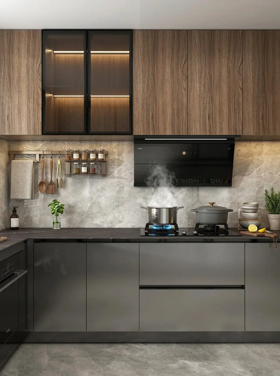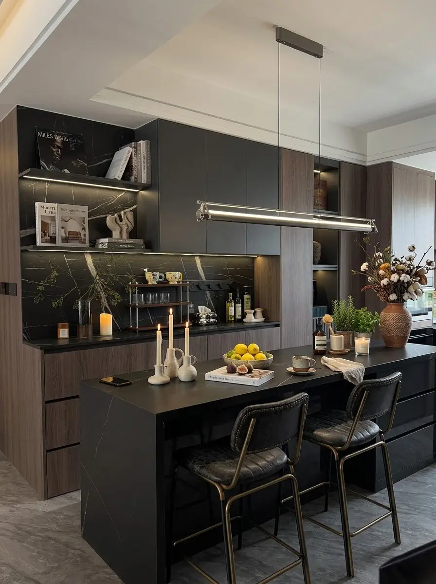 厨房与西厨岛台相连,深灰橱柜与木色吊柜形成对比,开放式布局让烹饪与社交无缝衔接,无论是一人食还是朋友小聚,都能自在舒展。