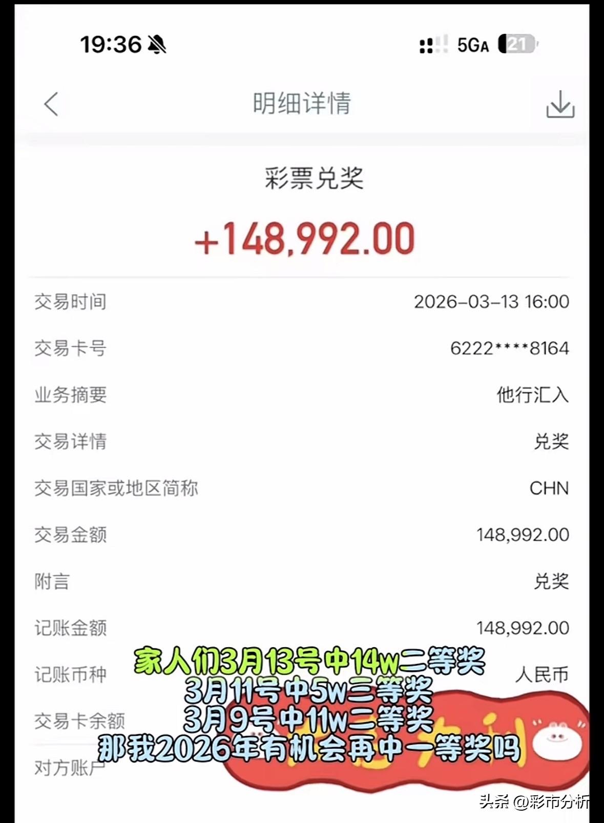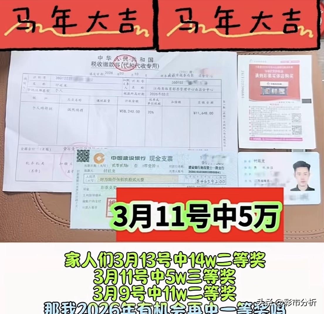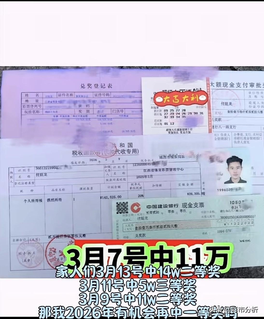 7中大奖、总金额超1200万的网红“付伯恩”(真名:付廷龙)又双叒中大奖啦!3月14日再次公开露脸赴中心领取大乐透二等奖14万元,此前3月7日中奖11万,3月11日中奖5万,这个月刚过半就已经先后三次中奖累计拿下30万,目前个人中大奖次数来到8次,奖金马上突破1300万,且每次都公开领奖晒照片甚至晒身份证,如此大胆操作堪称全网第一人,从运气角度来讲属实无解啊![赞][赞][赞][赞]