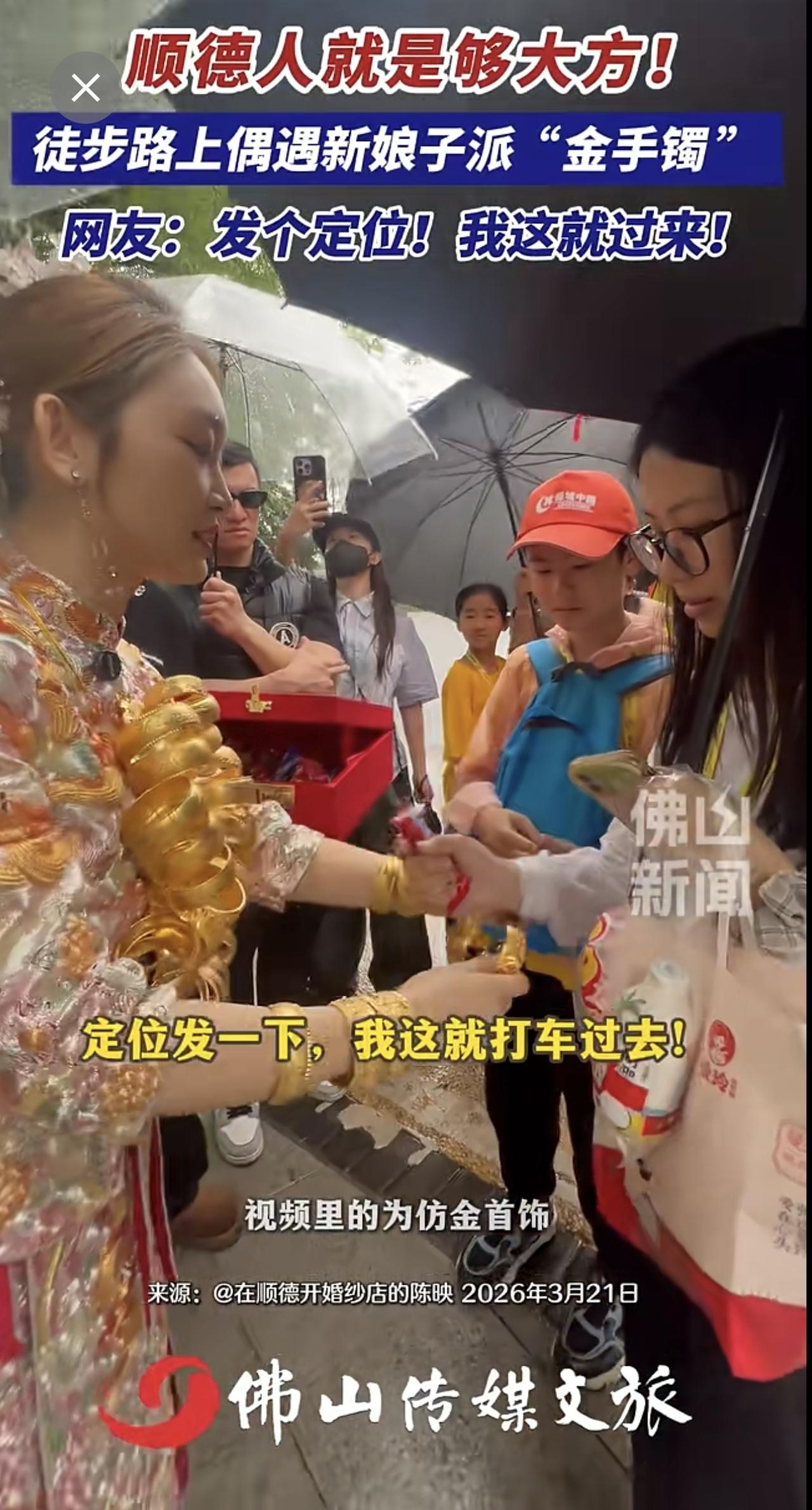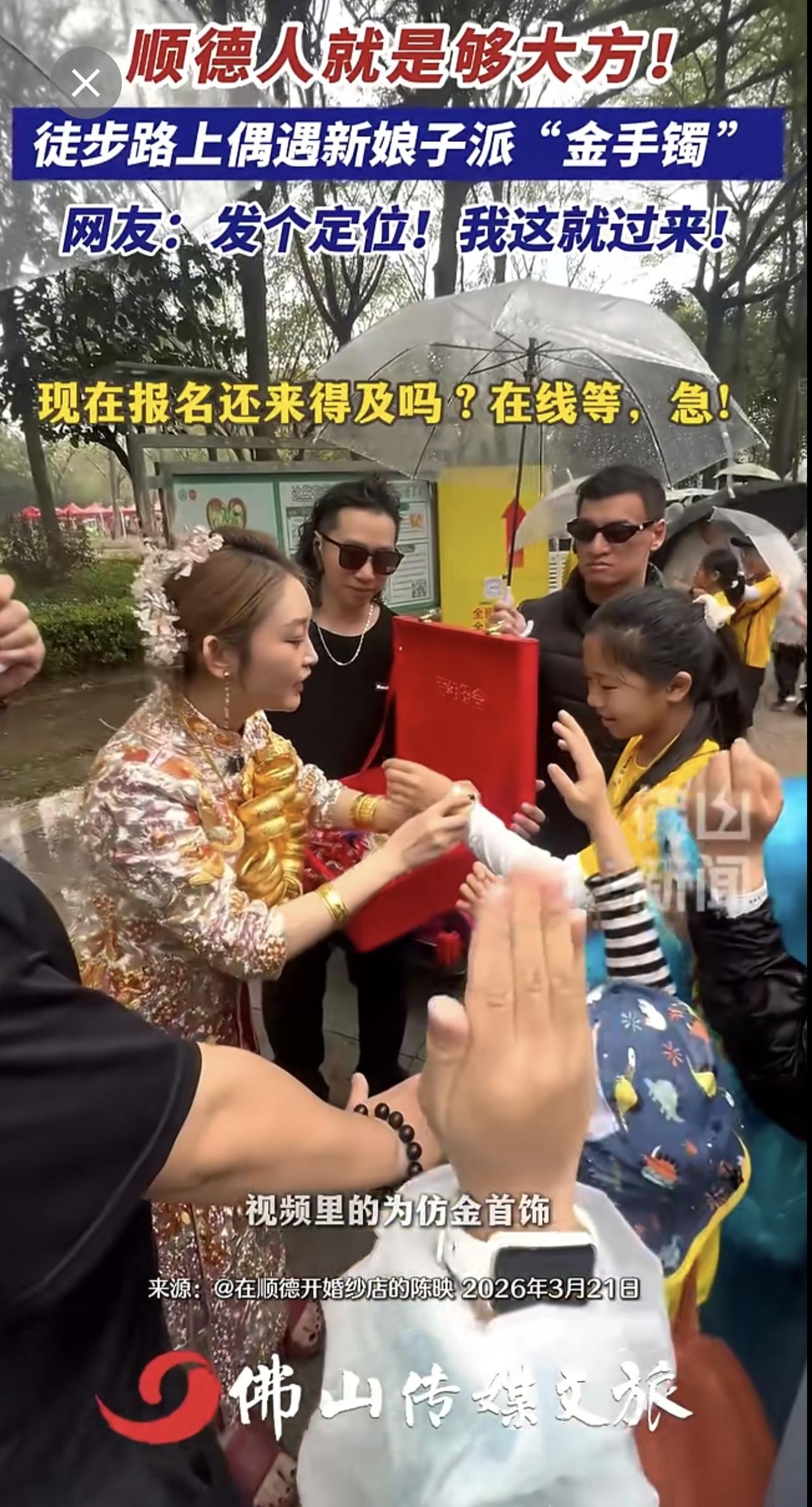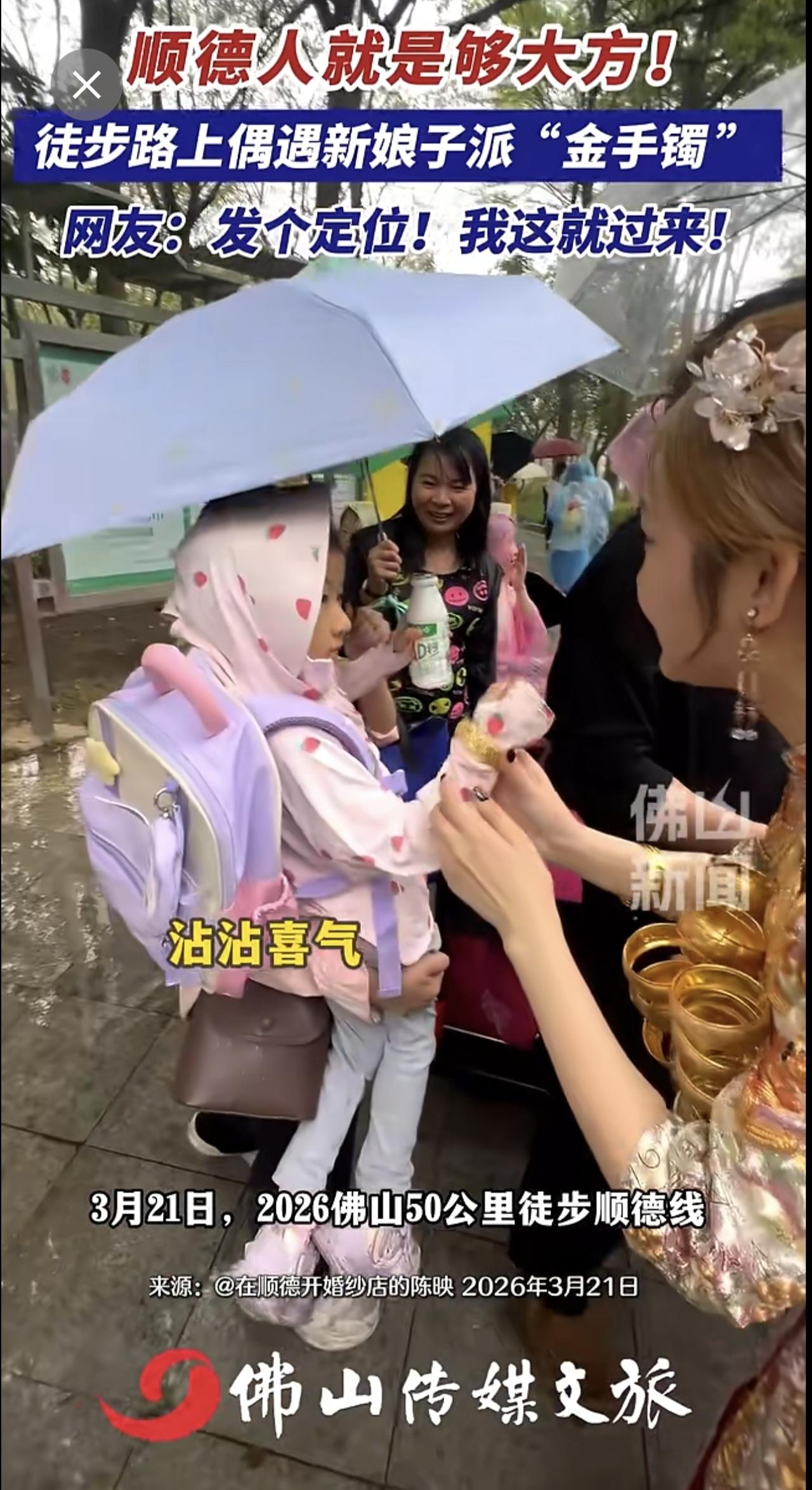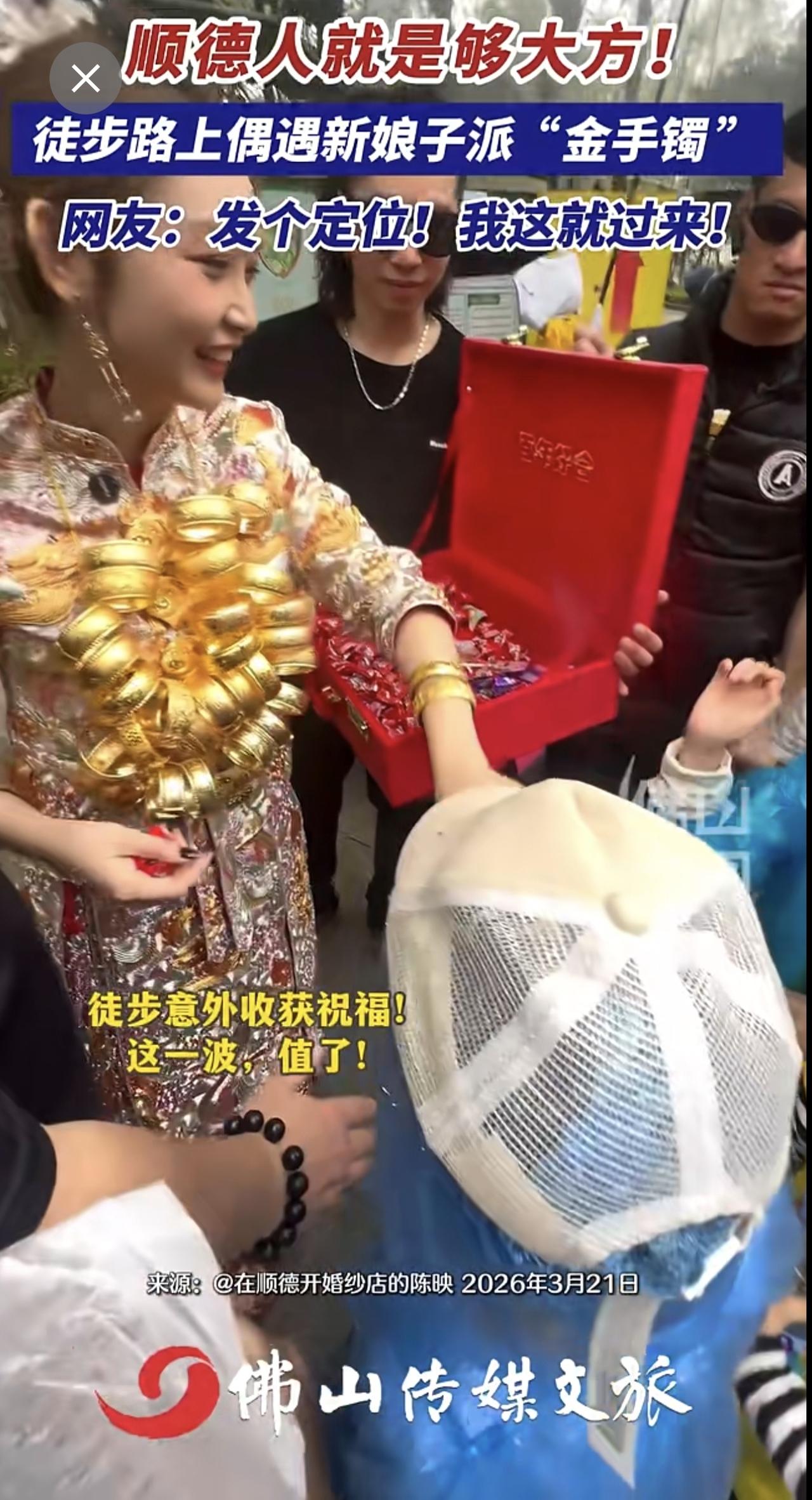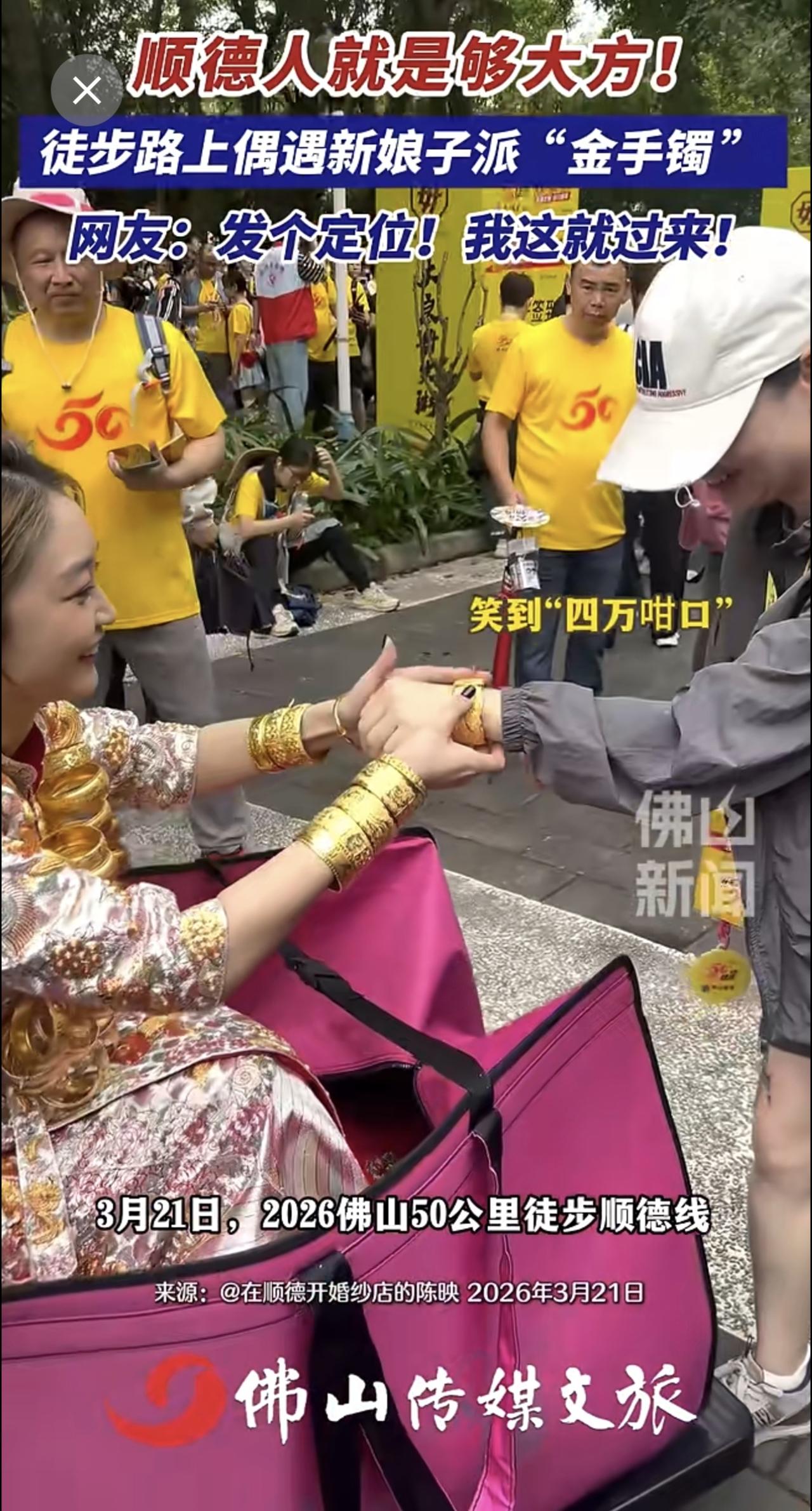 顺德人就是够大方!徒步路上偶遇新娘子派“金手镯 ”,网友:发个定位!我这就过来!(记者:曾凝霜;编辑:唐欣瑜;责编:梁莹;素材来源:@在顺德开婚纱店的陈映)金手镯 新娘 佛山50公里徒步 2026佛山50公里徒步 万万没想到