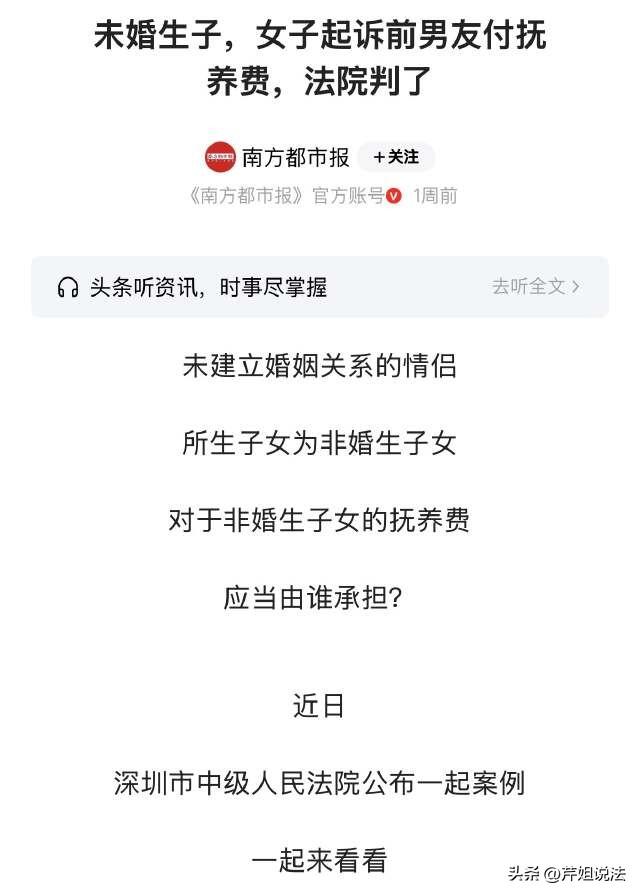 深圳,一女子跟男友相恋同居之后,二人生下了一个小孩。孩子出生了,女子就有些烦恼了,毕竟两个人还没领证,更让她苦恼的是,男友似乎也不想负责,并没有考虑结婚。之后,两个人感情逐渐出现裂痕,男友真的就把女子给甩了。分手之后,孩子跟着女子生活,一开始男子还肯支付生活费,可是后来逐渐就耍赖皮,直接拒绝支付抚养费。 这可把孩子妈妈气的,虽然小孩非婚生子,但是也是享受着法律的保护的。于是,女一纸诉状,将前男友给告了。 (南方都市报3月10日报道了这则新闻。) 一年轻女子林女士,跟自己的男友王某相识,二人很快就确定了恋爱关系。 后来感情升温之后,二人也就搬到一起居住,正式开启同居生活。 一开始的感情,肯定是很甜蜜的,小情侣两个,每天的生活都是非常幸福的。 直到某一天,女友林女士突然感觉身体不适,去检查才发现自己怀孕了。 没多久,林女士就给男友生下了一个可爱的宝宝。 面对这个孩子的来临,王某则感到有些不适应,一时间无从招架。 可能在他看来,经济方面有些拮据,养个女朋友还可以,再养个小孩,生活不一定能够有保障。 林女士为了未来着想,询问男友的意思,她希望可以尽快有个家。 但是男友似乎自始至终都没考虑迎娶自己,他也不想结婚,两个人为此闹得不可开交。 结局也可想而知,昔日甜蜜的情侣,最终也只能走到情感的尽头,二人终于分手了。 分手的时候,男友表示:孩子是自己亲生的,他作为孩子的父亲,一定会负责到底的。孩子可以跟着林女士生活,但是他每个月都会给孩子打生活费。 前面三年,王某倒是定期会给孩子打钱,有的时候打5000元,有的时候打6000元,至少是给钱的,能够给孩子起码的生活保障。 但是三年之后,王某就开始耍无赖了,再也没有固定打钱过来。 只不过林女士有的时候追要,孩子念书要用一些学习用品,他就会支付部分的费用过来。 大概之后的7年里,王某一共零零散散给孩子打过来45000元。 当林女士再次开口要钱的时候,却难如登天。 而林女士表示,虽然孩子不是婚生子,也是他亲生的小孩,怎么能说不管就不管呢? 林女士一纸诉状,准备把孩子的爸爸给上诉了,要求他继续支付孩子的抚养费,并且把之前的也要补齐。 王某之前赖账的部分,也要重新计算吗? 答案是肯定的,相关部门也介入调查了,最后给出了如下的审判。 截止到目前为止,扣除王某已经支付的45000元,王某还需要把没有履约的部分补齐,合计金额177500元。 另外,自此之后,王某每个月需要按照2500元每个月的标准继续支付抚养费,一直到小孩年满18周岁为止。 王某认为这个孩子也不是婚生子,试图逃脱抚养义务,拒绝继续支付抚养费。他的做法是否合理呢? 肯定是不合理的,而且还违法。 男方作为孩子的亲生父亲,抚养给孩子支付抚养费,这是法律的明确规定,如果拒绝支付,不仅违背了伦理道德,甚至触犯法规。 根据《民典法》第1071条规定,非婚生子女享有跟婚生子女同等的权利,任何组织或者个人不得加以危害或者歧视。 另外,法律还有所规定,不直接抚养非婚生子女的一方,必须负担未成年子女或不能独立生活的成年子女的抚养费。 在王某看来,“没结婚”、“没领证”,似乎就成为他逃避责任的挡箭牌,这可不是耍赖的理由。血缘亲属关系不会因为婚姻状态而改变,抚养义务也不会因此消失。 作为孩子的亲生父亲,王某必须支付抚养费,这是法定义务,而不是施舍。 如果王某后期继续拒绝支付小孩的抚养费,女方林女士则可以以孩子的名义,请求相关部门介入处理,申请强制执行,将王某名下的钱款直接划取。 态度过于恶劣的,情节非常严重的,甚至可能会涉及拒不执行判决、裁定罪,到时候王某要面临的惩处会更为严厉。 抛开没领证生娃的情况来看,呼吁情感要理性,要有一个稳定的、健全的婚姻,要给孩子一个稳定的生活环境,如此才能给孩子提供更为全面的保障。 对此,你怎么看呢,欢迎评论区留言讨论。