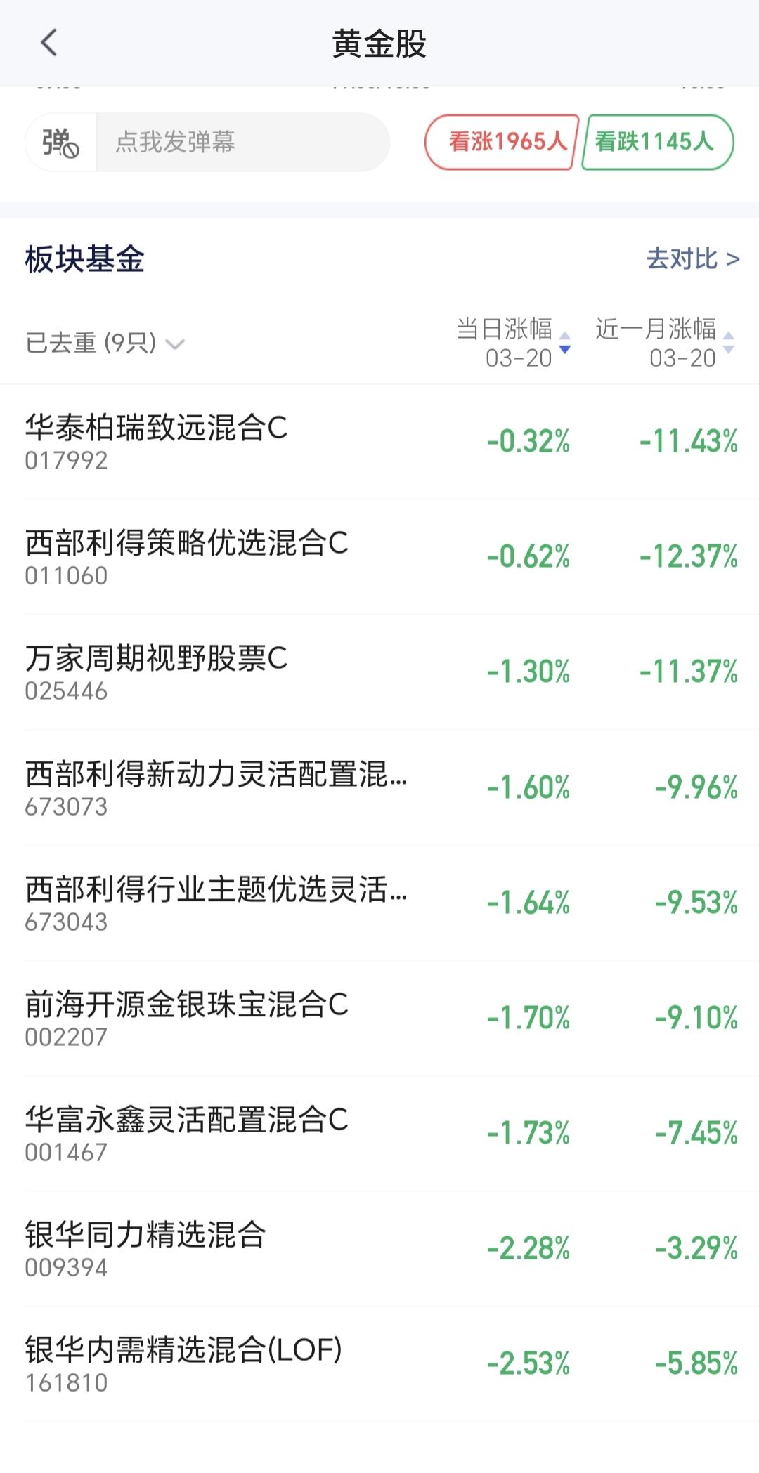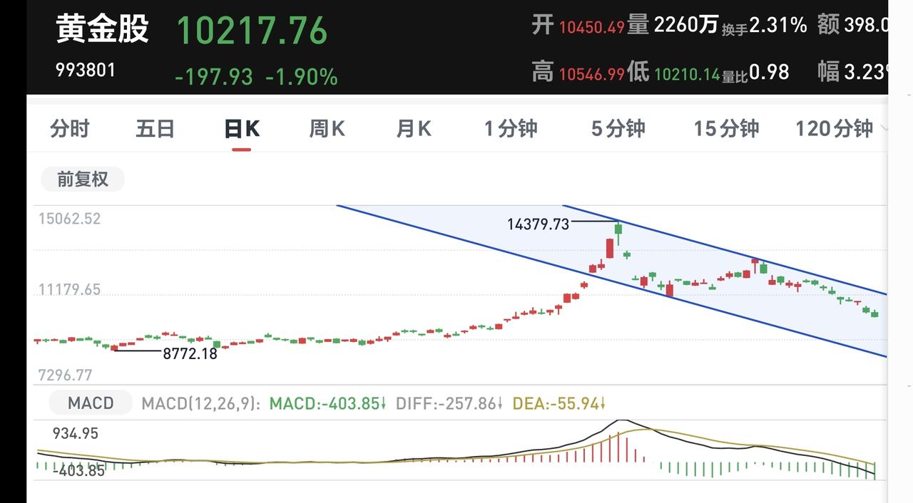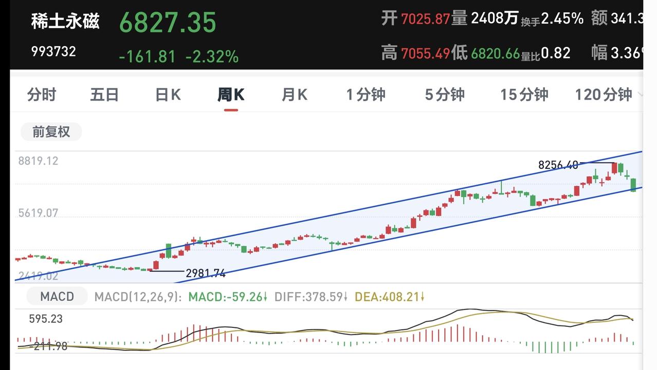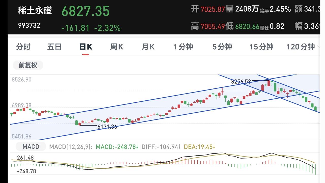 基金:黄金股板块和稀土永磁板块(周末分享的板块6和7) 最近市场在震荡调整的过程中,许多人接受不了这样小幅度的调整,这样的小幅度调整都让他感觉天塌下来了,但如果我告诉他,有两个板块已经连续下跌了8个交易日,不知道他有何感想,黄金股板块和稀土永磁板块就是已经连续下跌了8个交易日,黄金股板块持有人数在所有板块当中排名第3位,黄金股板块基金的情况见下面的截图2,稀土永磁板块持有人数在所有板块当中排名第4位,稀土永磁板块基金的情况见下面的截图3。 黄金股板块日线级别处于下跌通道中,这个板块日线级别短期趋势向下,想要进场,这个板块需要等待日线级别短期趋势反转向上,只有上涨突破这个日线级别下跌通道上轨线的时候,才可以观察是不是趋势反转,只有上涨突破这个日线级别下跌通道上轨线的时候,才可以考虑要不要进场。 黄金股板块周线级别处于上涨通道中,星期五的下跌来到了这个上涨通道下轨线附近。近期观察会不会跌破这个上涨通道的下轨线,如果有效破位这个上涨通道的下轨线,长线持有的人需要注意风险。 稀土永磁板块日线级别处于短期下跌通道中,星期五的下跌来到了这个日线级别短期下跌通道下轨线附近,近期观察是在下轨线附近止跌反弹,还是会跌破这条下轨线,进入加速下跌状态。 稀土永磁板块周线级别处于上涨通道中,周五收盘的时候稍微跌破了这个上涨通道的下轨线,但还不能看作是有效破位,是不是有效破位还需要继续观察,如果是有效破位周线级别上涨通道的下轨线,长线持有的人需要注意风险。 没有只涨不跌的板块,黄金股板块的走势说明了这一点,没有永远上涨的板块,稀土永磁板块的走势说明了这一切,涨多了是风险,跌多了是机会,涨多了落袋为安,跌多了抄底进场,其他的时间都是等待,玩基金其实玩的就是这两件事情,玩基金其实玩的就是高买低买,跟做生意是一模一样的,但你要想在最高点卖出,在最低点买进,那你就是痴人说梦,那你就是自己不认识自己,自己根本不知道自己是几斤几两。 昨天晚上到今天已经分享了恒生科技板块,AI应用板块,白酒板块,cpo板块,创新药板块,加上现在的黄金股板块和稀土永磁板块,总共是七个板块,前面几个板块还没有看的人可以往上翻看一下,周末的时候我还会陆陆续续分享部分板块,大家有时间的时候都可以看一下,还有哪些板块需要分享的,可以写在评论区。
