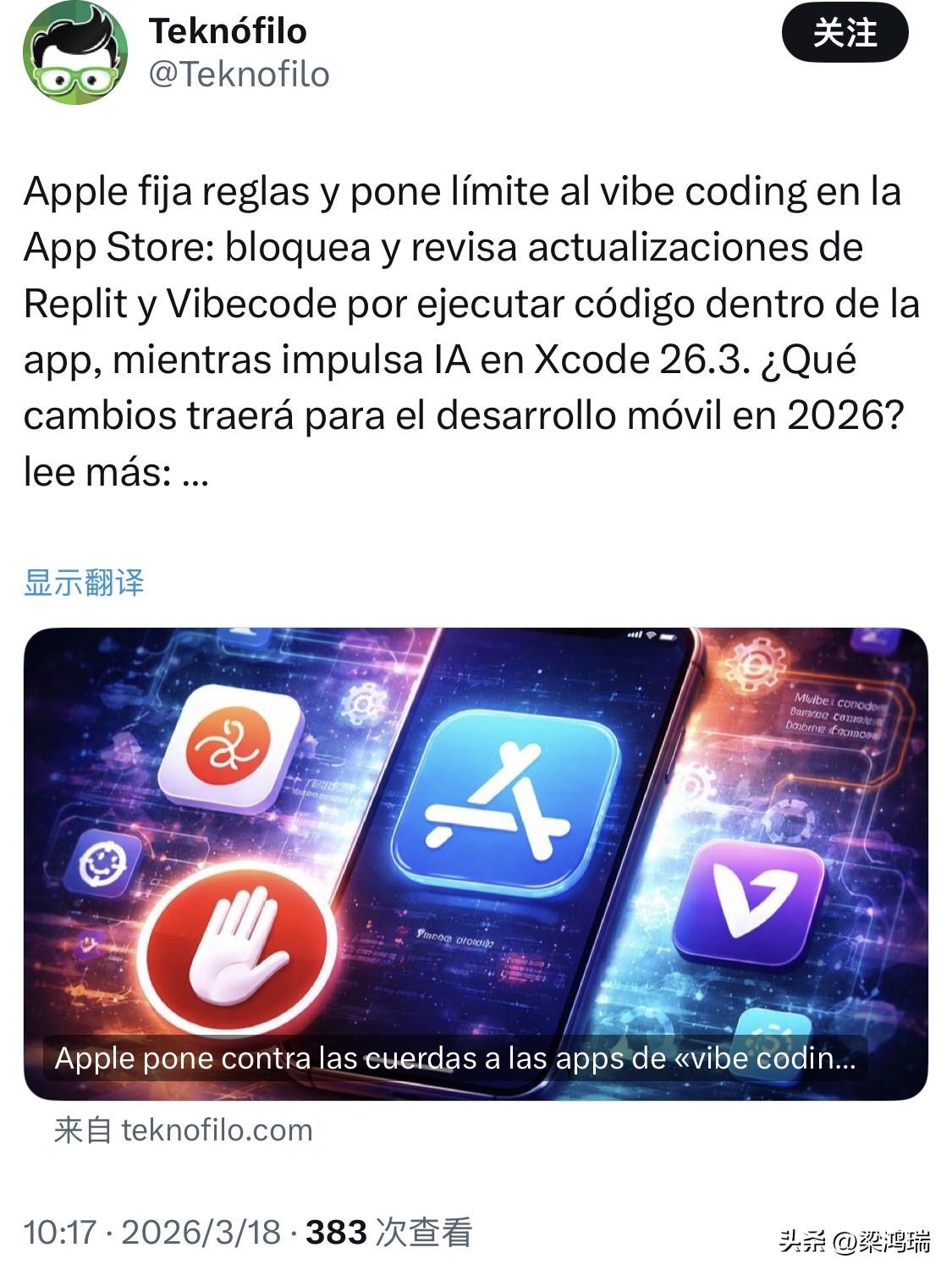 苹果重拳封停AI编程产品,3月18日消息,据The information报道,苹果公司证实,该公司已阻止 Replit、Vibecode 等Vibe Coding AI编程类应用在 App Store应用商店发布移动版更新,除非这些应用做出修改。这类工具可帮助用户制作游戏及其他应用。 简单来说,Vibe Coding AI编程应用工具,可帮助开发者使用无需上架App Store的网页应用,进行开发软件,这对苹果构成潜在威胁,而App Store应用商店正是苹果核心营收与利润来源。 苹果则强调,已告知部分开发者,这类Vibe Coding编程功能违反了其长期执行的 App Store 规则—应用不得运行会改变自身或其他应用功能的代码。