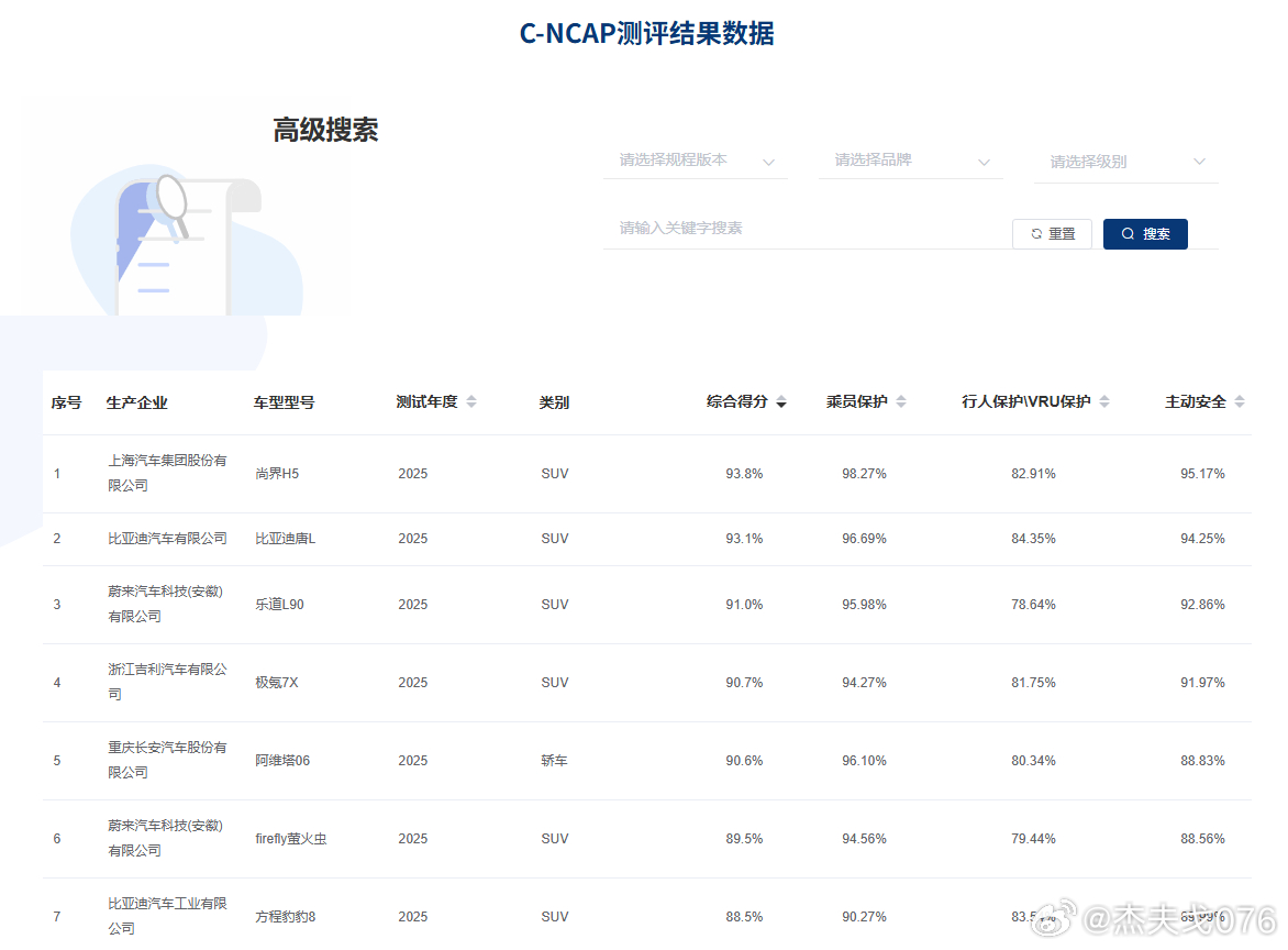 鸿蒙智行问界汽车安全 全新问界M7 C-NCAP最高成绩95.0%,是不是吹牛。到C-NCAP官网看了下,95.0%的成绩确实是最高的,比同品牌的M9的93.9%高不少不过还不知道95.0%的细分得分怎么样,拭目以待。