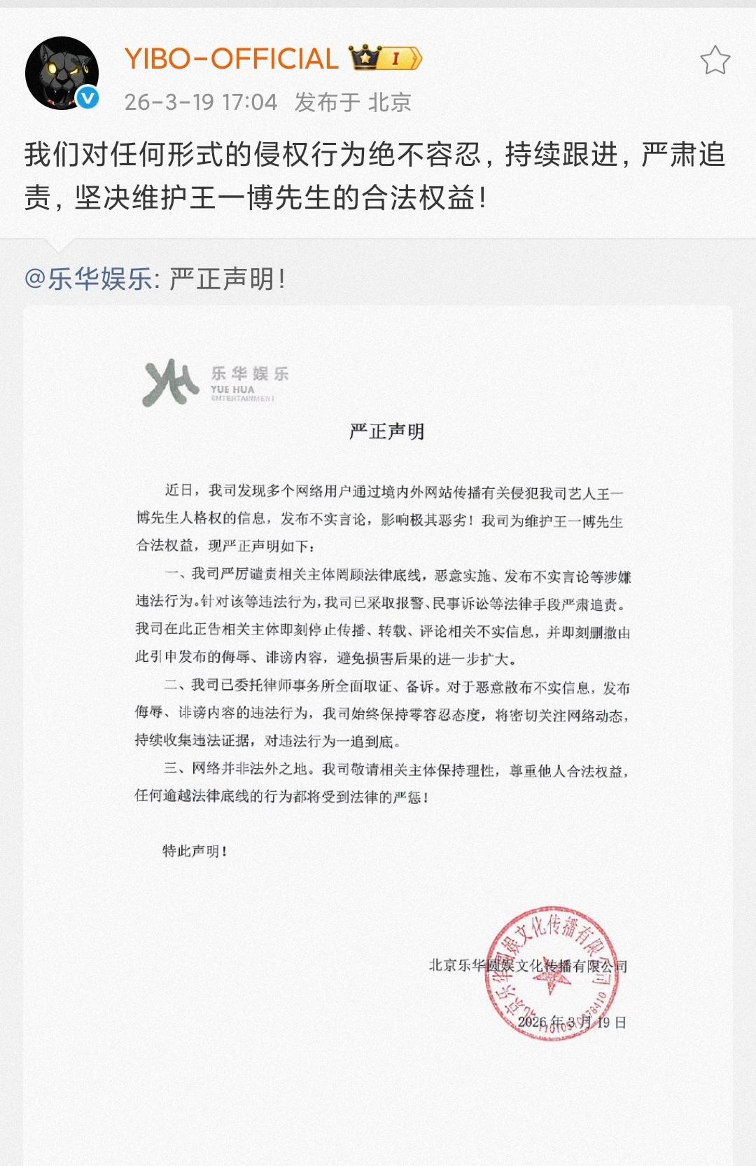 数次澄清,严正声明!某些人某些群体却依然无休无止的恶意构陷、编造谣言、联动传播…… 而仅仅是在头条发布了王一博所属公司的告黑声明,就被某人及其工作室举着身份证投诉下架,为什么?难道他们知道被告的就是他们自己人是吗?难道这一切的恶意之后…… 总而言之,网络非法外之地,对恶意构陷、诽谤,制造、传播谣言者坚决零容忍! 坚决支持王一博先生合法维权! ps:终于告小虎头这个职黑了!!!