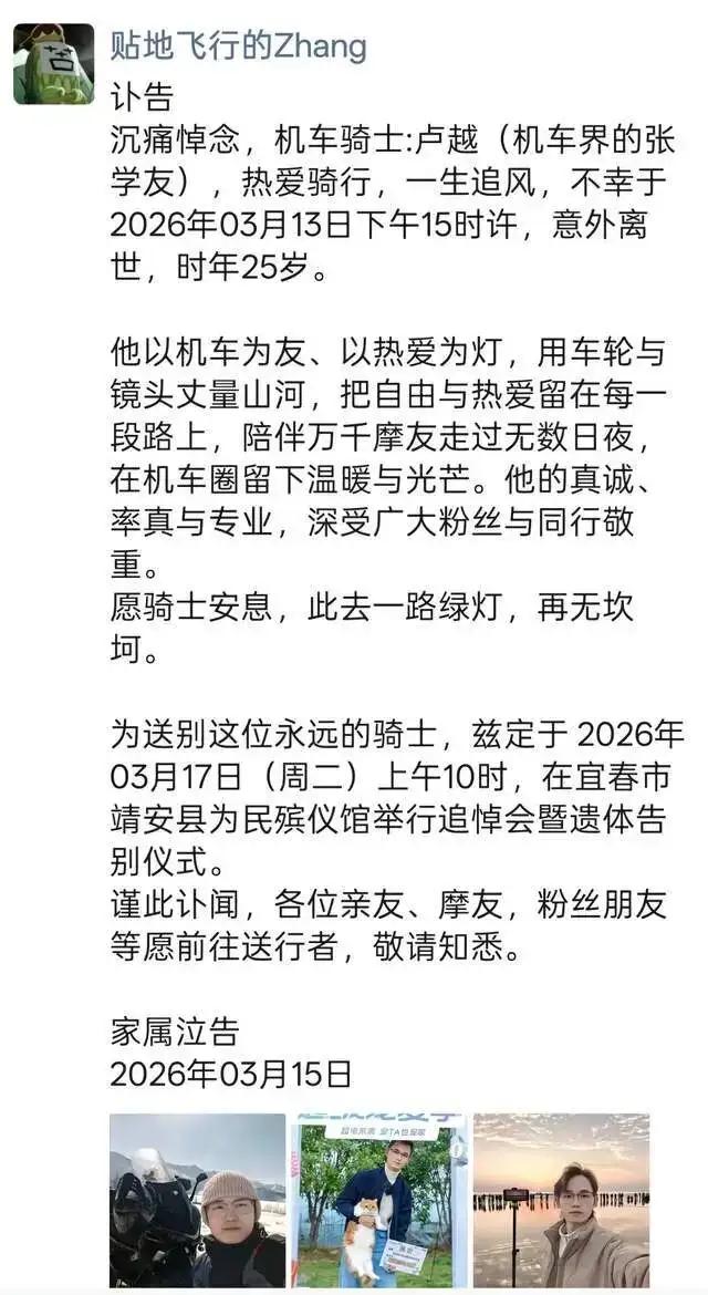 3月13日,25岁机车博主卢越因车祸去世。2023年8月,他曾以174km/h的速度摔车受伤,对着镜头说“再也不敢了”。一年半后,他还是没管住右手。 速度的本质:170km/h时,每秒47米,反应时间0.5秒已跑出23.5米。一旦突发状况,技术、装备、经验全部失效。人的反应速度有物理上限,而速度没有。 为什么“教训”无效:极限驾驶会不断上调风险阈值,加上“风险补偿效应”——越觉得自己控制得住,越会主动增加风险。第一次是警告,第二次是教训,第三次可能就是告别。 网红身份的压力:镜头在催、粉丝在看,出片需求分走注意力。当“拍视频”成为骑行的一部分,安全已经被打了折扣。 结语:你追求的那几秒钟刺激,值不值得用一辈子换?路上没有观众,只有家人在等你回家。