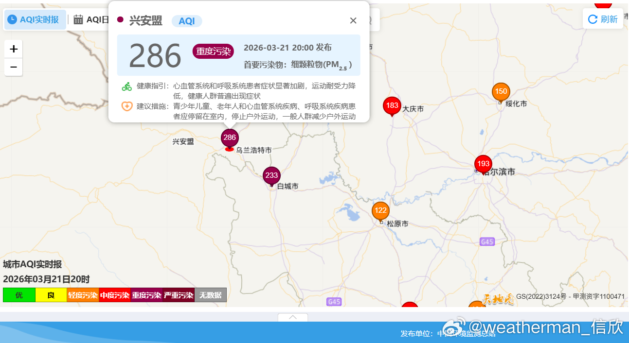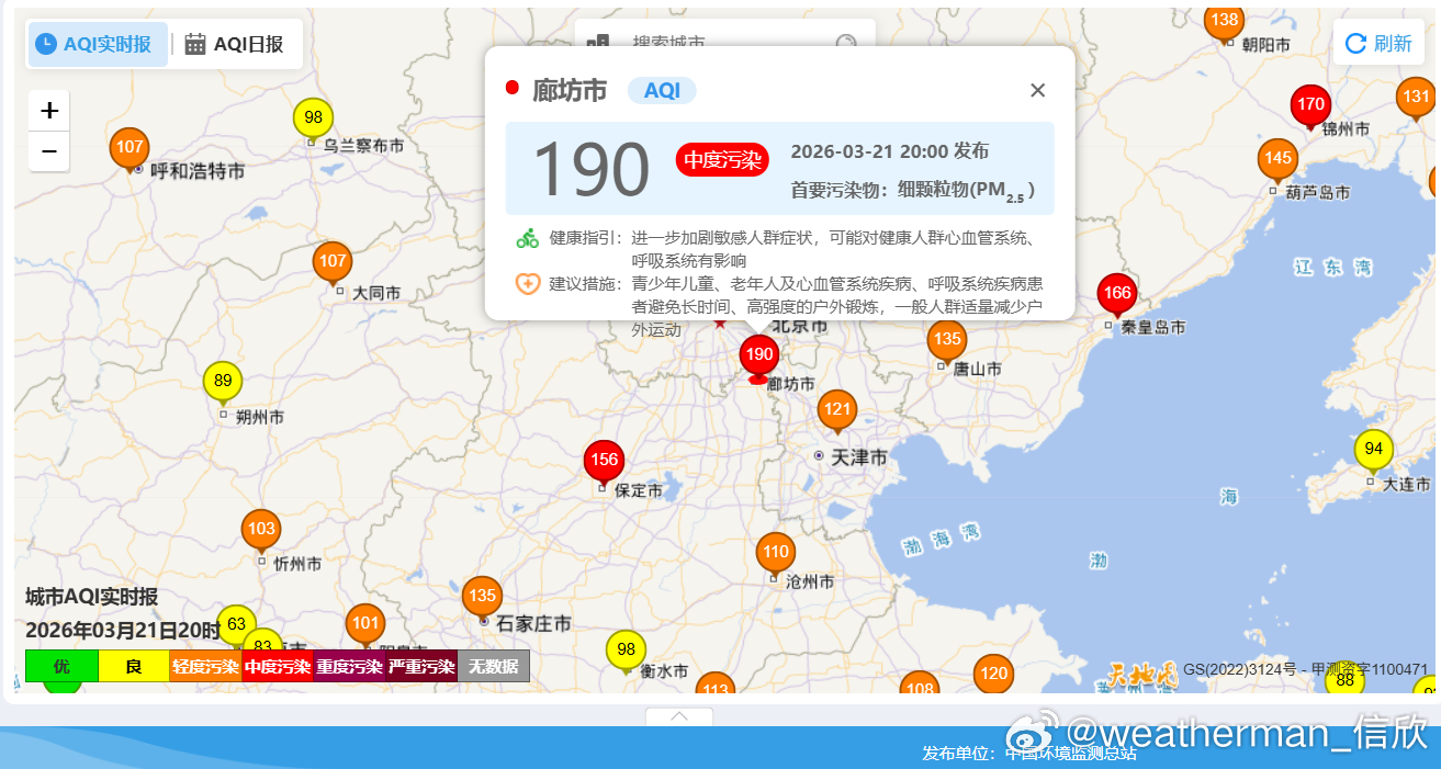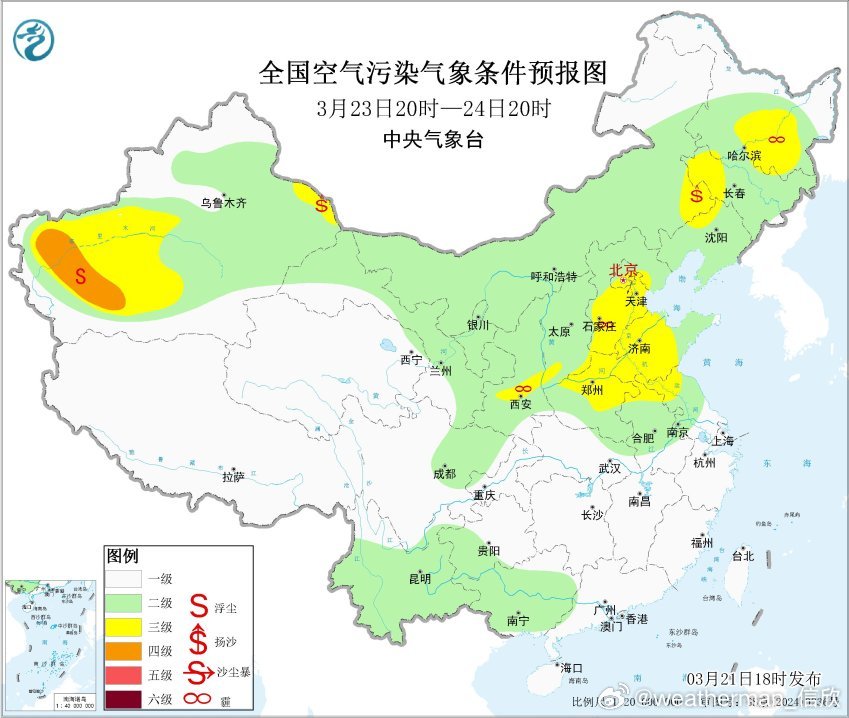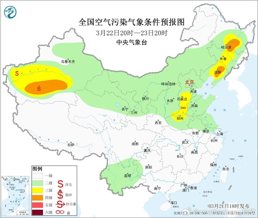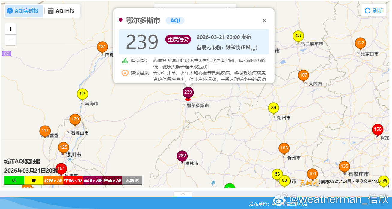【雾 霾 沙尘】今晚20时空气质量,北方多地出现污染。西北地区以及内蒙古河套一带,是沙尘导致的PM10超标,比如内蒙古鄂尔多斯、陕西榆林出现重污染。东北华北黄淮因为霾,对应PM2.5超标,内蒙古乌兰浩特、吉林白城出现重污染,河北廊坊有中度污染。