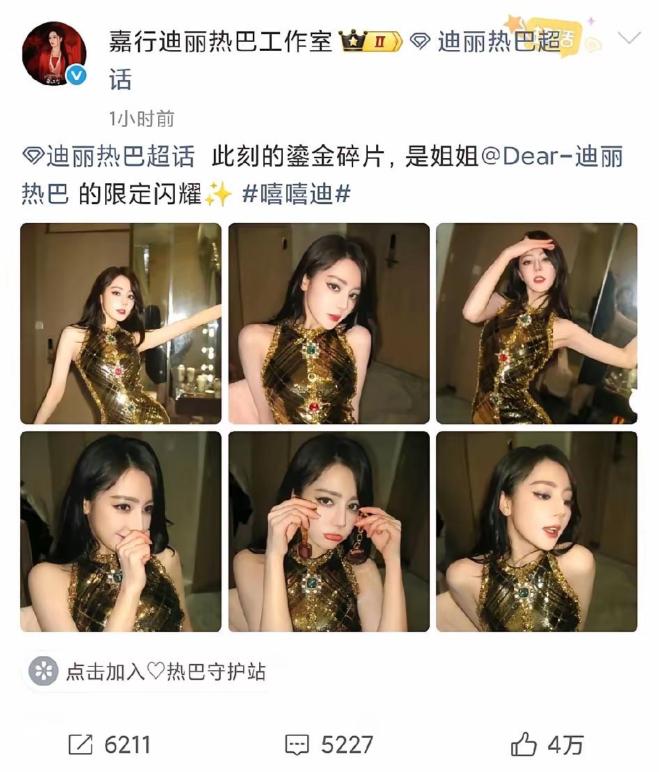 迪丽热巴这表情,看得懂吗?我能说一下,不是什么金色带宝石的珠宝都美,都有品味嘛? 迪丽热巴人真的美,但是太金太闪的衣服,就还是有点俗啊。 这身迪奥,就和 LV 把大 logo 贴胸前一样。蓝宝石,红宝石镶嵌在衣服中央。 然后是大粉色钻石耳环,大到比麻将牌还大。 怪不得迪丽热巴笑不起来了。 浑身珠光宝气,有点过了。