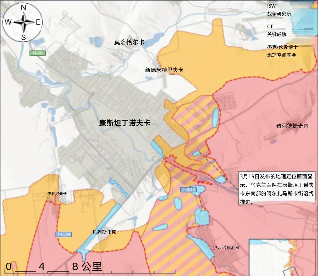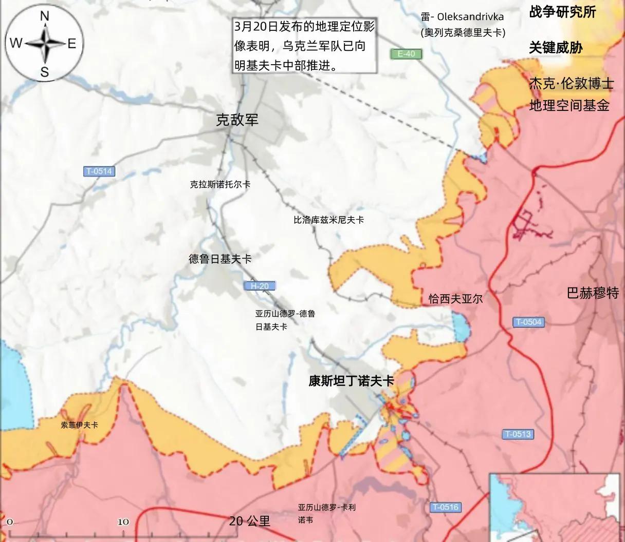 决战双子城之外围争夺:乌军两日三捷 3月19日至20日,地理定位视频显示,乌军在利曼、康斯坦丁诺夫卡连获三捷,有效遏制俄军多路突击态势,稳固双子城北部与东北翼关键屏障,为整体防御争取主动。 在利曼方向,3月19日发布的地理定位 视频显示,乌军在亚姆皮尔南部(利曼东南)完成战术推进。 当天,俄军在利曼周边发起全域攻势。乌军利曼方向某旅发言人披露,俄军莫斯科军区第20诸兵种合成集团军投入的步兵仅接受不足一周基础训练,远低于2025年中后期一月标准训练周期,兵员素质与作战能力显著下滑。 乌克兰顿涅茨克州军事行政长官菲拉什金3月20日下令,对斯拉维扬斯克区域实施儿童强制撤离。 在康斯坦丁诺夫卡方向,3月19、20日地理定位视频确认,乌军在康斯坦丁诺夫卡东南及明基夫卡中心(康斯坦丁诺夫卡东北)成功推进,加上利曼方向的推进,两日内乌军在双子城外围拿下三个战术要点。 俄军事博主宣称俄军在新帕夫利夫卡以北(德鲁日科夫卡西南)推进,该消息尚未获证实。 亲克里姆林宫俄军事博主3月20日援引地理定位视频称,乌军或控制恰索夫亚尔西南舍甫琴科微区,乌军持续坚守恰索夫亚尔,直接阻断俄军迂回包抄康斯坦丁诺夫卡的战术企图,为双子城正面防御筑牢侧翼。 乌克兰顿涅茨克州检察院通报,3月20日俄军FPV无人机袭击亚历山德里夫卡-德鲁日科夫卡救护车,造成2名平民死亡、2人受伤。 (本文部分参考战争研究所报告)