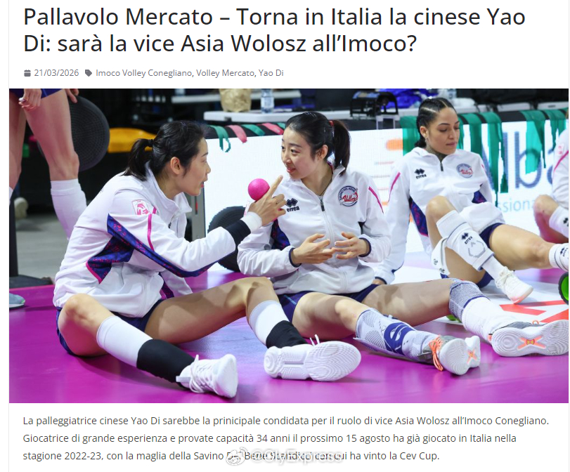 【意媒曝姚迪成科内替补二传热门人选】中国排球留洋动态排球转会动态 3月21日,据意大利媒体报道,姚迪成为沃沃什下赛季在科内利亚诺替补人选的领跑者。“8月15日将34岁的姚迪曾在2022-23赛季效力斯坎迪奇,并赢得欧联杯。”如果成行,“姚迪将与国家队合作多年的队友朱婷再次聚首。”