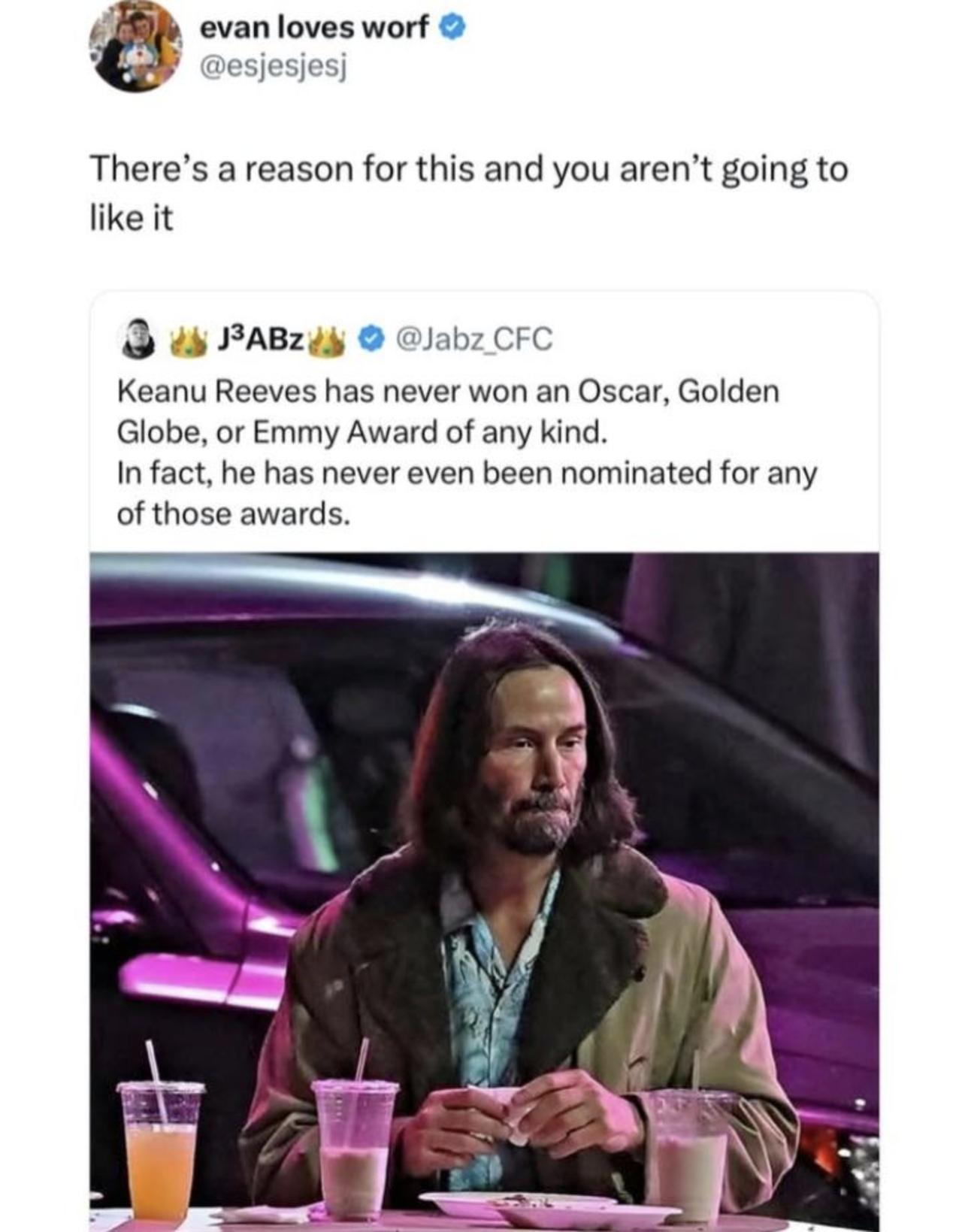 近日,一则关于基努·里维斯(Keanu Reeves)的梗图,图上写道:"基努·里维斯从未获得过奥斯卡、金球奖或艾美奖——事实上,他甚至从未获得过任何奖项提名。" 这则看似简单的陈述,实则暗藏机锋。基努·里维斯在大众文化中享有极高声望,他主演了《黑客帝国》《疾速追杀》《生死时速》等一系列票房与口碑俱佳的商业大片,性格温和、为人谦逊,是许多人心中"好人"的代名词。然而,这样一位备受爱戴的演员,职业生涯中竟从未获得过主流电影奖项的任何认可。 社区讨论中,有人将话题引向演技本身的定义。有人评论指出,表演的深度与广度并非等价,基努的戏路虽相对固定,但他对角色的驾驭能力毋庸置疑。也有观点援引尼古拉斯·凯奇(Nicolas Cage)的例子——两人同属一类演员形象,凯奇却凭借《离开拉斯维加斯》摘得奥斯卡桂冠,形成耐人寻味的对照。 更有人翻出基努早年《我自己的爱达荷》《惊情四百年》等文艺片中的表现,认为他在独立制作中的演出颇具层次,并非只会动作片中的"酷"。然而,这些角色终究未能为他换来一座奖杯。 这一悖论之所以成为笑点,在于它揭示了一种常见的文化现象:大众口碑与学院评价之间往往存在显著落差。基努·里维斯或许不是评论界的宠儿,但他在观众心中的地位早已无需任何奖项证明——这种"民间封神、官方沉默"的错位,恰恰构成了这则梗图的幽默核心。
