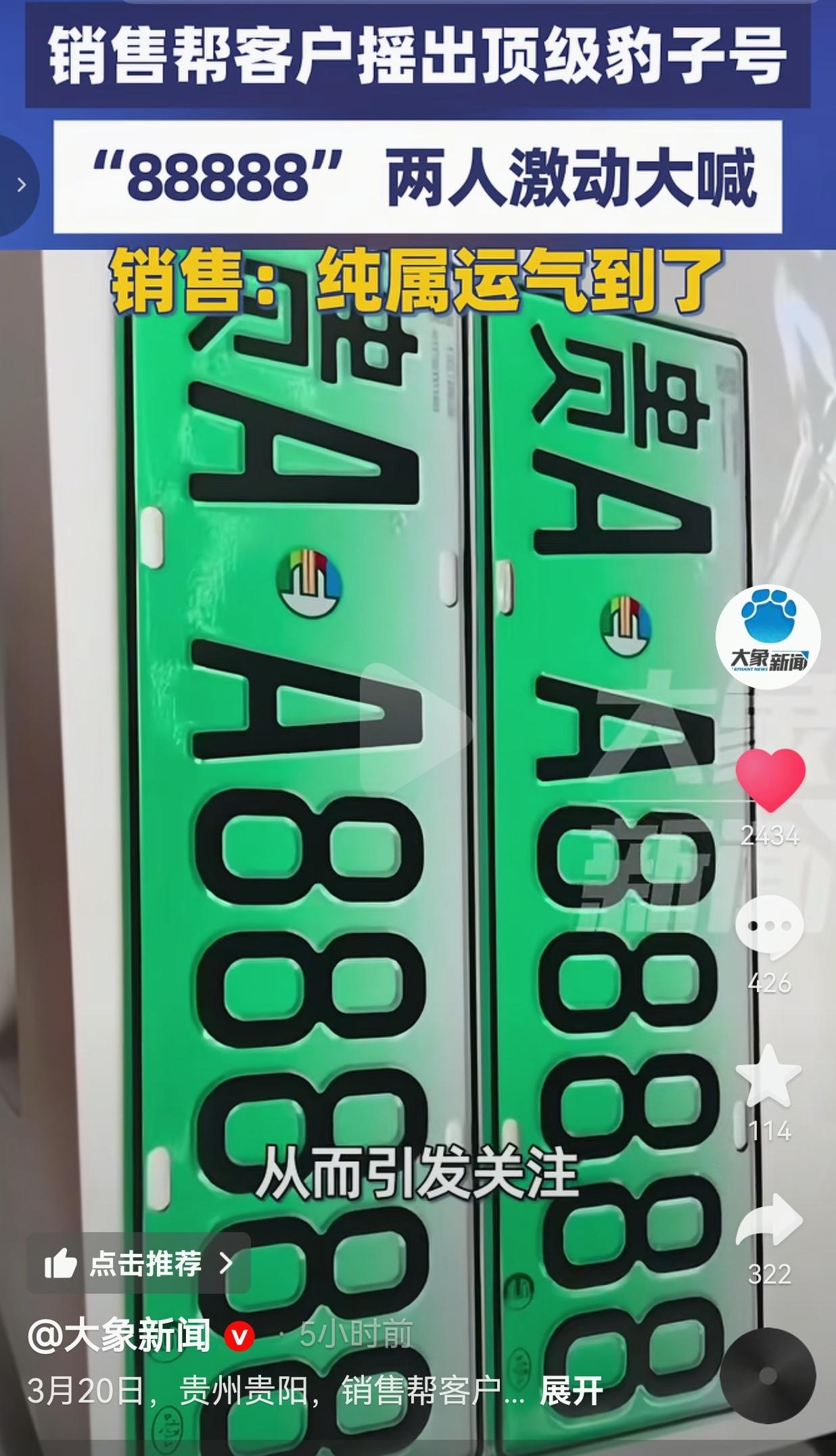 贵阳一销售人员帮客户摇出“贵A·A88888”!两人当场疯喊:这手是开了光吧! 3月15日贵州贵阳,车行销售黄先生随手一点,直接帮客户摇出五连8顶级豹子号,俩人盯着屏幕愣了三秒,接着抱着大喊“豹子!豹子!”,这运气直接炸了全网! 这事说出来都像演的,但真就发生在贵阳一家车行里。 那天客户来选新能源车牌,本来就是走个流程,黄先生作为销售,顺手帮着在机器上点了一下摇号。 谁知道屏幕一蹦出来,贵A·A88888这串数字直接晃瞎眼——五个8连在一起,绿底黑字,比过年的红包还晃眼! 俩人一开始都不敢信,揉了揉眼睛反复确认,直到系统跳出来“选号成功”,才彻底绷不住了,在车行里扯着嗓子喊,连路过的大哥都凑过来围观:“我去!这号能换半套房了吧!” 现在这车牌已经正式上牌,黄先生对着镜头挠头笑:“真就是纯纯运气,我自己都懵了,活这么大第一次见这么顺的号!” 网友看到后评论说:“我摇了三次都是带4的,人家随手一点就五连8?老天爷赏饭吃都没这么直接!” 也有的网友说:“天呐!这号挂车上,以后停车保安都得客客气气的!羡慕到流口水!” 也有的网友说:“别扯什么敛财,这就是纯运气!我要是这客户,当场得给销售包个大红包!” 还有的网友说:“酸了酸了!同样是摇号,我摇的是“车牌”,人家摇的是“行走的人民币”! 我看完这段视频,直接拍桌子喊“离谱”! 这哪是摇号啊,这简直是老天爷往怀里塞钱! 有人酸溜溜说“不就是个号吗,至于这么激动?” 我想说的是,对普通人来说,这不是一串数字,是半辈子都碰不到的好运,是开车出门都能多笑三声的底气,是跟朋友吹牛逼能吹十年的谈资! 那些说“炒作”“敛财”的,纯粹是见不得别人好!人家凭运气摇的号,既没违规也没暗箱操作,凭什么不能激动?凭什么不能开心? 换你你试试,要是摇出个五连8,你比他喊得还大声! 真正让人羡慕的,从来不是这号值多少钱,是那种“天上掉馅饼正好砸我头上”的狂喜——是平凡日子里突然炸响的烟花,是枯燥生活里突然砸下来的甜,是我们每个人都偷偷盼过的“好运降临”。 运气这东西,从来不分高低贵贱,砸到谁头上,谁就有资格放声大笑!