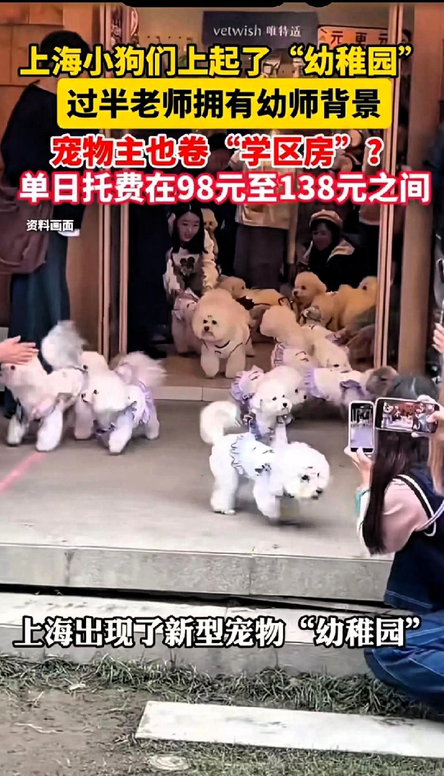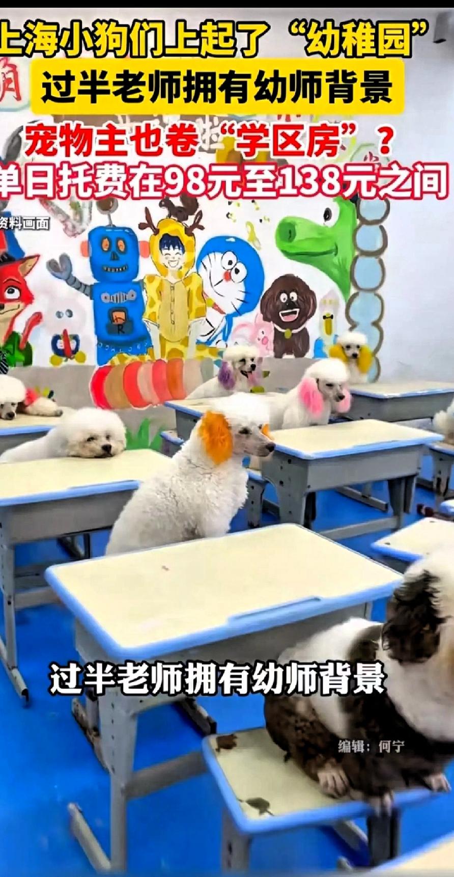 大千世界真的无奇不有! 这个世界颠倒到已经不是我们所认识的世界了! 最近上海滩出了个新鲜事儿, 没想到上海这么前卫,给狗狗们也上起了幼儿园,而且幼儿园过半的老师有幼师背景,还有专业的训导师指导。 这家幼稚园每日接待的学生约为20只,单日托费在98-138元之间。 这吸引了不少无暇照顾狗狗的上班族及老年人,不少人驱车一小时跨区接送狗狗,甚至搬家租住学区房... 有网友感叹:“活的不如狗!”[捂脸]
