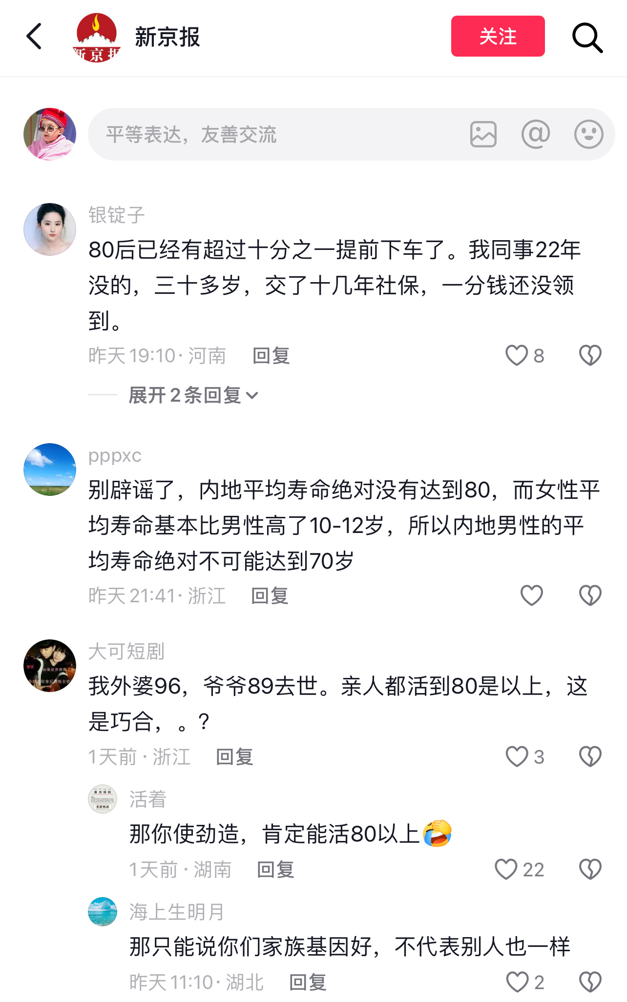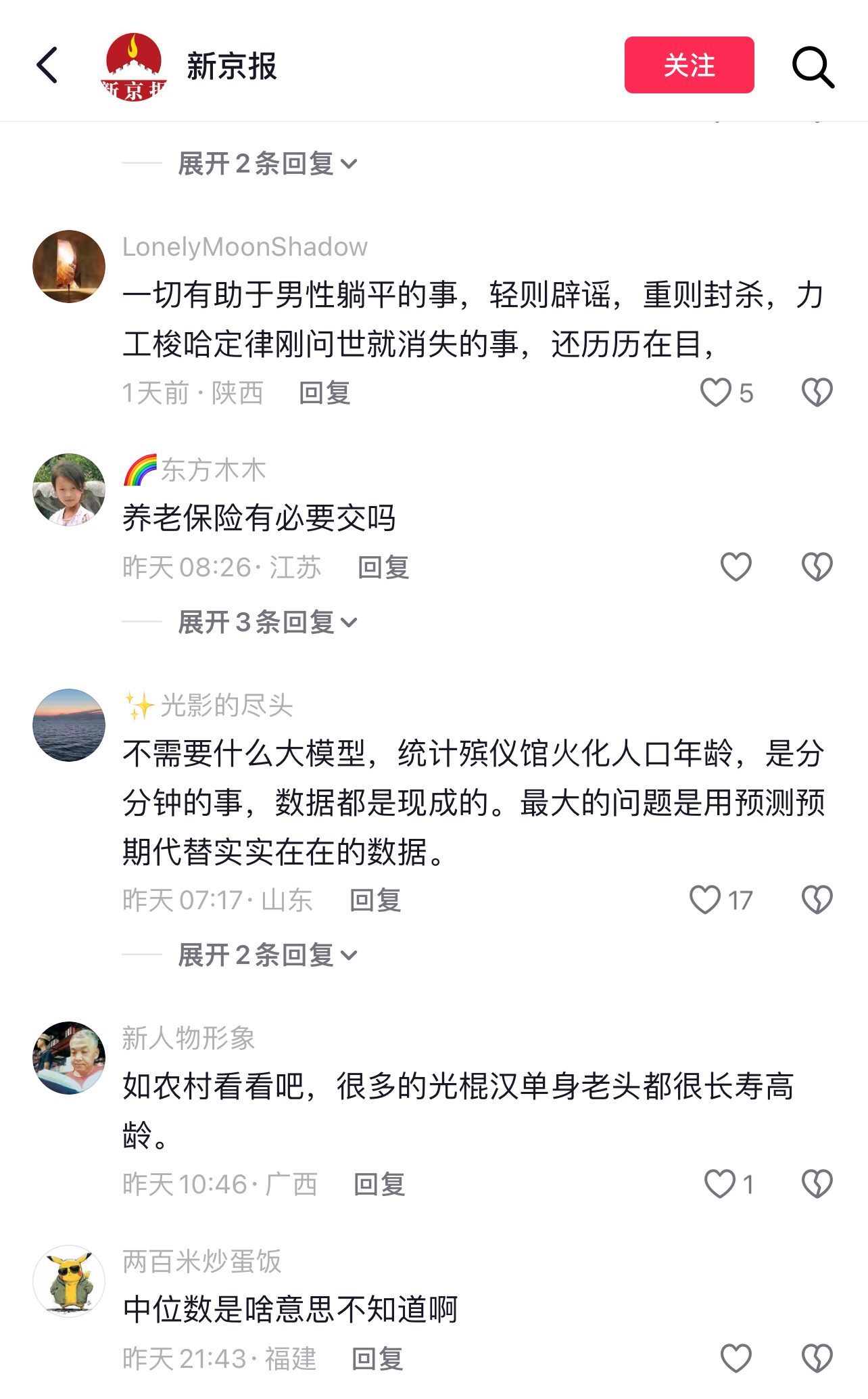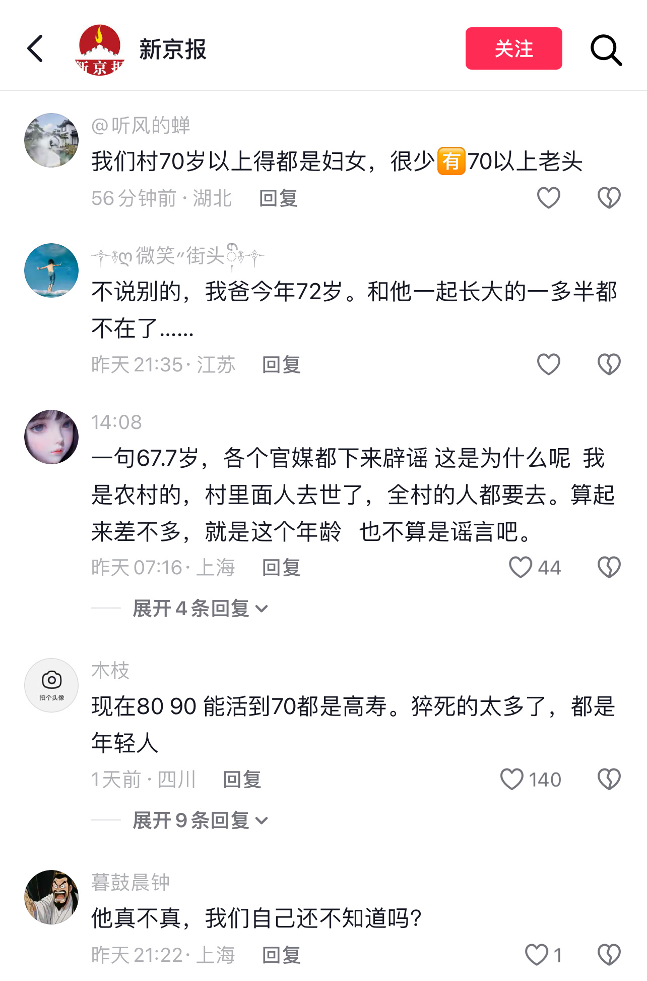 新京报辟谣“一半中国男性活不过67.7岁”不过这条辟谣的评论区……