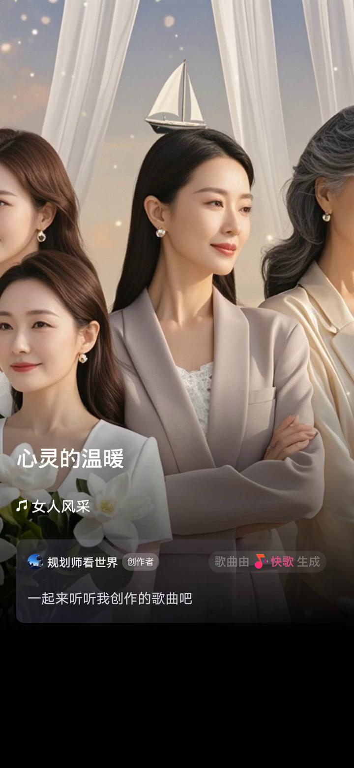 女人风采。 规划师看世界创作者。 歌曲由快歌生成,一起来听听我创作的歌曲。 倔强扬帆起航,挣脱懵懂的迷茫。婚姻殿堂多了份悠扬,职场上绽放光芒。家庭里温柔守望,用智慧平衡着方向让世界熠熠闪。女性每年龄段活出最飒的自己,心灵的温暖是最大的欣喜,灵魂的相遇是最美的相识。徐娘魅力沉淀美丽生长,优雅诠释着成熟的力量辉煌。大娘时光里寻得真谛,家人相伴不再追逐世俗的名利。内心的宁静是最美的旋律,心灵的温暖是最大的慰藉。 女性每年龄段活出最飒的自己,都有乘风破浪的勇气。心灵的温暖是最大的欣喜,灵魂的相遇是最美的相识。一份爱发自内心深处,那是最纯粹的情感流露。一份感动来自信任的托付,让彼此的心灵不再孤独。有情的人生美好如初,每一个瞬间都值得记录。有爱的路途风景美哭,陪伴着一起走过岁岁朝暮。 更多精彩内容上快歌,用音乐表达生活。