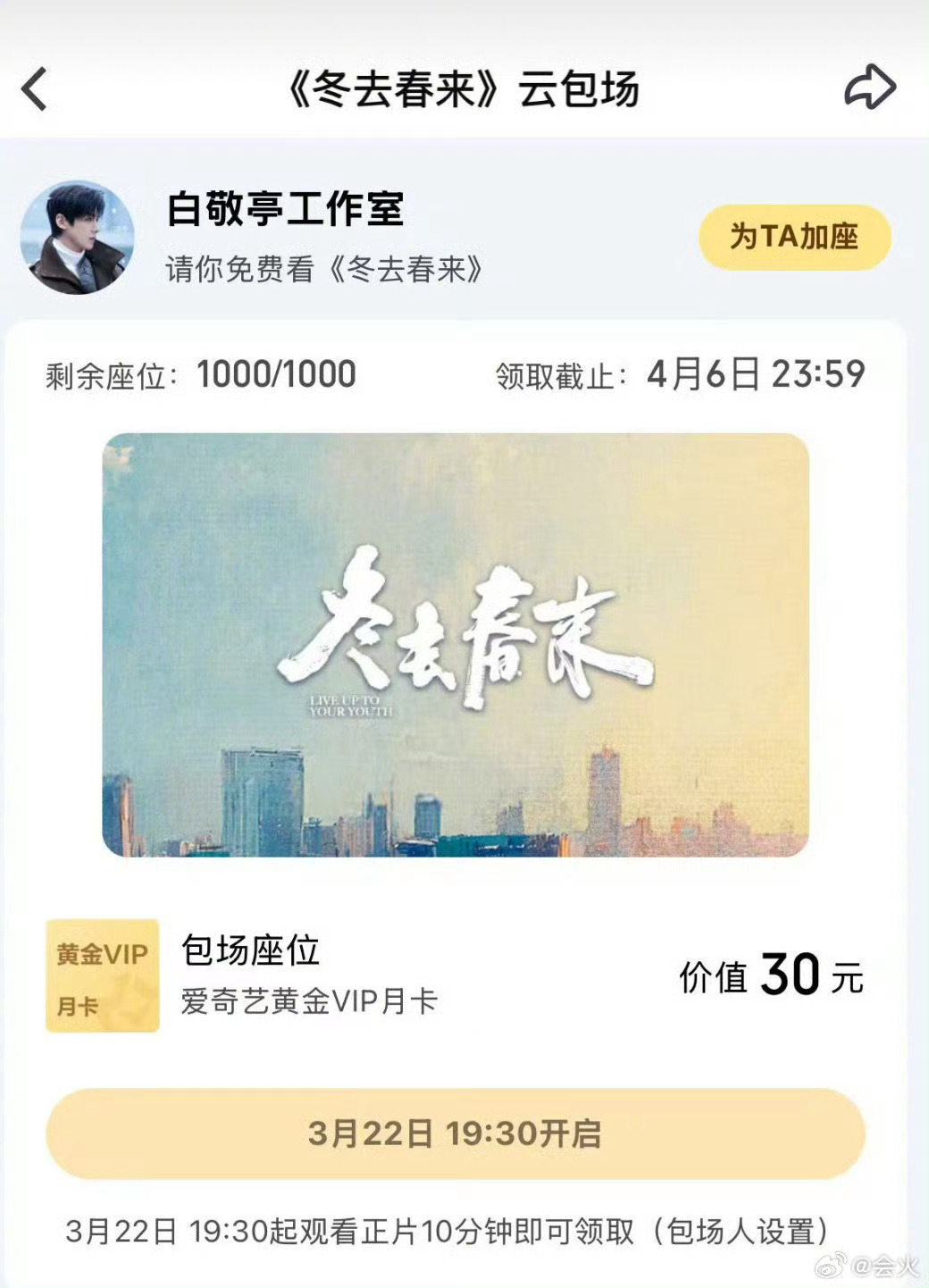 白敬亭包场章若楠冬去春来好友力满格!白敬亭暖心包场支持章若楠主演的《冬去春来》,