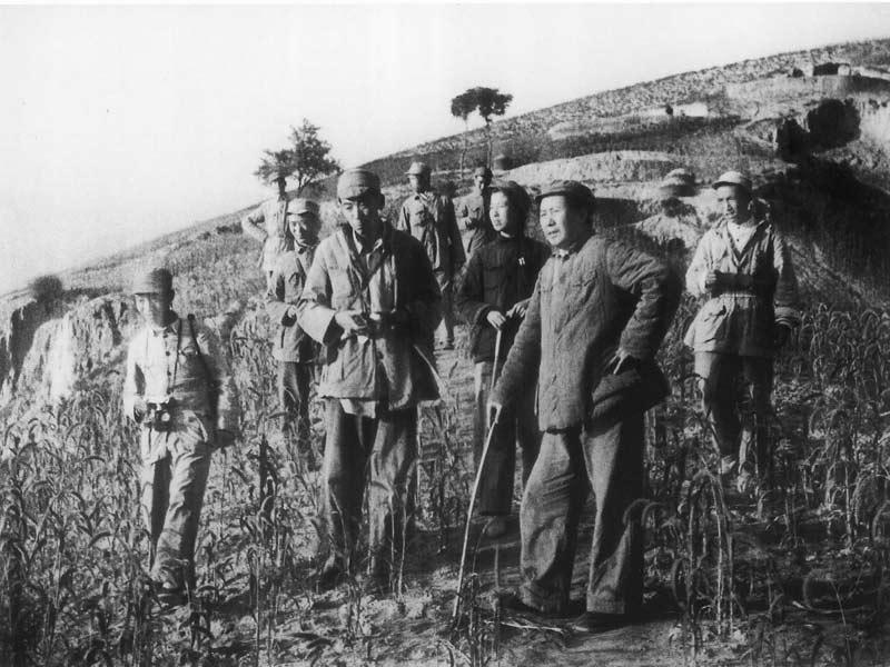 1947–1948年,陕北,毛泽东率领中共中央机关在陕北黄土高原行军。 画面右侧拄着木棍、身着粗布棉衣的是毛泽东,此时他正率领代号“昆仑纵队”的中央机关在陕北山区辗转,身边是警卫战士、参谋人员与随行摄影记者(左侧带相机者)。 毛泽东神色从容沉稳,虽身处艰苦行军,却依旧指挥若定;身边工作人员也都是朴素军装,与根据地军民同甘共苦,没有任何特殊待遇。 1947年3月,国民党胡宗南调集20多万兵力进攻延安,中共中央为诱敌深入、在运动中歼敌,主动撤离延安,毛泽东、周恩来、任弼时等坚持留在陕北,率领仅数百人的中央机关,在山沟里转战1年零5天,行程千余里;他们靠吃粗粮、住窑洞、走山路,在极端艰苦环境下指挥全国解放战争,成功牵制了胡宗南主力,为西北野战军及其他战场的战略反攻赢得宝贵时间。
