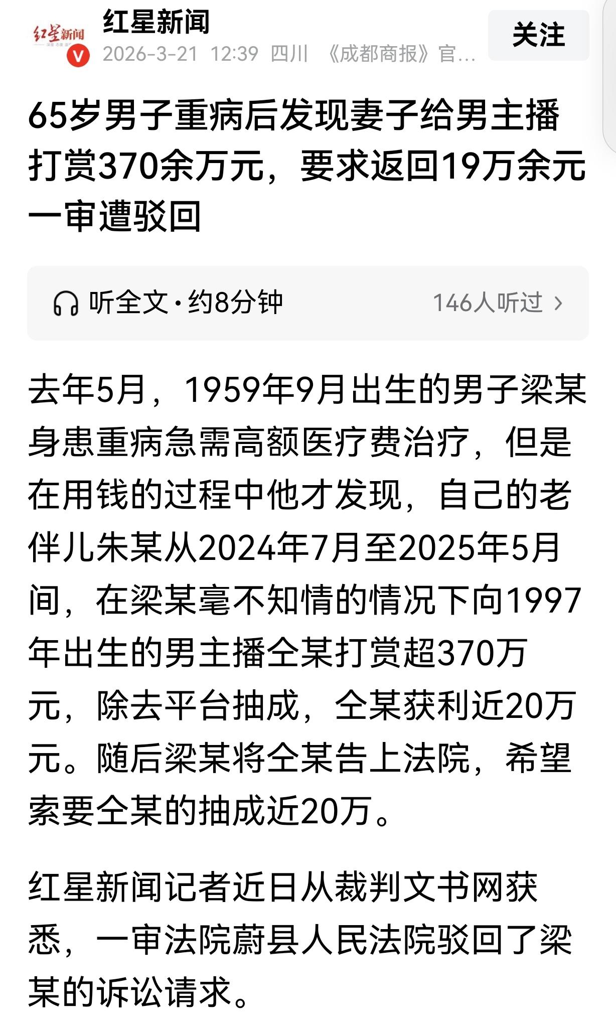 “女人花起来,就没男人什么事了!”河北蔚县,一65岁大爷重病,他取钱看病,银行卡竟空了,他这才发现,老太婆给29岁男主播打赏3749633颗钻石,合计3749963.3元,这370多万,主播才得了19万多,其中8099.2还是微信转账,大爷没钱看病,也不能等死呀,他愤怒的起诉男主播返还195580.85元。法院:打赏是娱乐支出,属于正常消费,驳回!大爷彻底傻眼了。 65岁的梁大爷2025年查出身患重病,需要立马手术。 有病不能拖,否则小病拖成大病,大病拖成病入膏肓,无药可治。 梁大爷赶紧去银行取钱,准备住可他一查余额顿时傻了眼,家里的积蓄几乎被掏空,只剩下一点零头。 他追问老伴才知道,和自己过了一辈子的老伴朱大妈,在过去10个月里,偷偷给一个29岁的男主播仝某,打赏了370多万,别说治病钱,老两口后半辈子的养老钱都没了。 朱大妈每个月退休金才3000块,平时过日子也省,谁也没想到她在打赏这事上这么大方,竟然比年轻人还疯狂。 事情要追溯到2024年7月,她刷到这个仝某的直播,对方一口一个“阿姨”叫得亲热,让朱大妈心里暖呼呼的。 一来二去,一下子拉进两人的拒绝,仝某是懂和人套近乎,准确拿捏人心里的。 他跟朱大妈聊天的时候,总说自己农村出身、单亲家庭过得不容易,朱大妈顿生同情,心一软就开始打赏。 后来俩人加了微信,仝某时不时给她发消息嘘寒问暖,说她是自己的“知心大姐”。 朱大妈觉得对方特别懂自己,越打赏越多,最多的一天打了15000多,前前后后227天里,有170天打赏都超过1000块。 这些钱一半多被抽走,仝某实际拿到手不到20万,其中还有8000多是朱大妈私下微信转给他的“生活费”。 梁大爷气得不行,自己等着钱救命,老伴把钱都打给了一个素不相识的年轻人,他转头就把仝某告上了法院,要求对方返还拿到手的19万多。 梁大爷觉得这钱是夫妻共同财产,朱大妈偷偷转出去,根本没经过自己同意。 而且,2人聊天内容还有点暧昧,明显超出了正常主播和观众的关系,这钱说什么也得要回来。 一审法院审完直接驳回了梁大爷的诉求。法官说朱大妈打赏的时候,是先在平台充钱买虚拟钻石,再用钻石买礼物打赏。 仝某拿到的只是虚拟道具,最后收益是平台结算给他的,相当于朱大妈花钱买了主播的表演、陪聊这些精神服务,属于正常的娱乐消费,不是白给的赠与。 而且,朱大妈每次打赏金额从几块到几千块不等,单次都没超出夫妻共同财产的合理处分范围,总金额高也是一次次累计出来的,不能因为总钱多就说消费无效。 至于梁大爷说的诱导打赏、违背公序良俗,他也拿不出实锤证据,法院没法支持。 现在梁大爷还在筹钱治病,朱大妈也后悔得不行,可钱已经花出去了,一时半会儿也追不回来。 梁大爷这事儿真是让人唏嘘,老伴一时糊涂,把养老钱、救命钱都搭了进去。 虽说打赏是个人行为,但朱大妈作为老年人,缺乏判断力,被主播几句甜言蜜语就哄得晕头转向,实在不该。 梁大爷维护权益虽难,但也给社会提了个醒,要关注老年人精神需求,加强监管,避免类似悲剧再发生。 《民法典》第153条规定,违背公序良俗的民事法律行为无效。 本案中,梁大爷主张朱大妈打赏违背公序良俗,但未拿出证据。 朱大妈打赏虽金额大,但单次未超合理范围,且是购买精神服务,难以认定违背公序良俗,故法院不支持返还诉求。 对此,你怎么看?