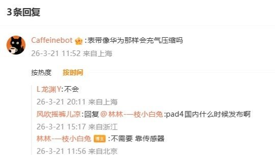 有网友询问该功能的实现是否需要表带充气压缩,林林回复称:“不需要,靠传感器。”