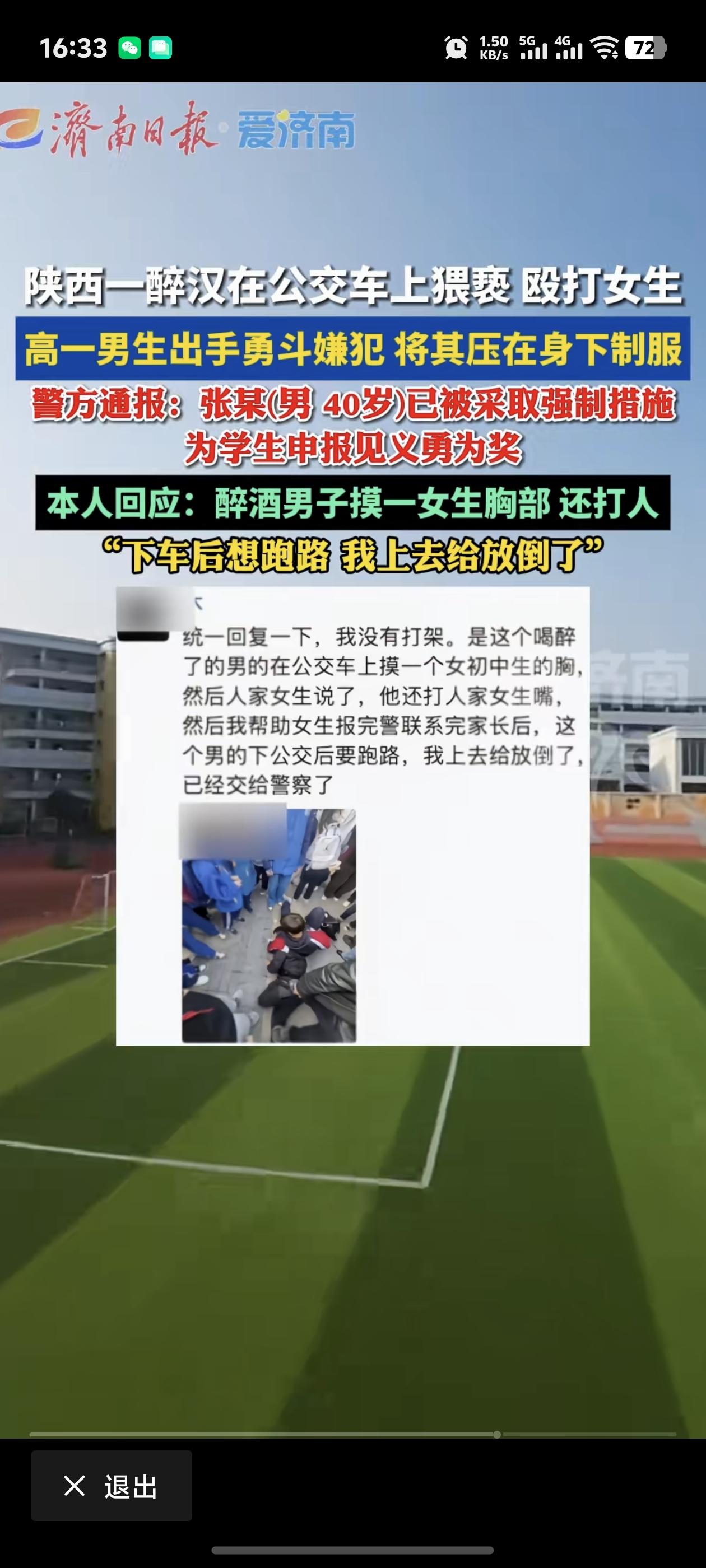少年可畏!陕西延安,一醉汉在公交车上,明目张胆的猥亵并殴打一名初中女生,期间一名高一的男生见状后,不但勇敢的制止了醉汉保护了女生,下车后醉汉想跑,男生还果断出手制服了醉汉,并将其交给了警察。 现场一张男生制服醉汉图片可见,男生当时身着一件黑红白色校服,并凭借他个人之力,愣是把黑衣醉汉牢牢压于身下,而周围也围着很多身着校服的学生围观。不过就这姿势来看,当时的醉汉是被男生给制服得服服帖帖的了。 此事在网上引发热议后,这名见义勇为的高中男生也发文对此事做出了回应。男生表示,当时他没有打架,就是乘坐公交车时,见到一名喝醉了的男子,在公交车上猥亵一名女初中生。而初中女生面对男子的骚扰,也是勇敢的出言试图制止男子,结果男子还嚣张的出手打了女生的嘴。 此时男生勇敢的挺身而出,直接上前制止了男子的行为,并帮助女生报了警,联了系家长。男子见状可能是怕了,下公交后就要跑路,于是男生果断将男子放倒制服,并交给警察同志处理。 后续延安警方通报,该名40岁嫌疑人已被采取强制措施,警方也对这位勇敢的男生申报了见义勇为奖! 而男生勇斗醉汉的见义勇为行为,也是赢得网友们的点赞和认可。有网友就夸赞道:谁家培养的热血男儿!家风,家训,家教都出类拔萃的德行,堪比一等功臣!好样的少年! 还有网友表示:小伙子好样的!自古英雄出少年!建议高考加20分,如果报考警校的话,小伙子如此正义感,也可以酌情考虑[赞] 更有网友表示:少年侠气,见义敢为!高一学子挺身护弱,勇制歹徒,必须为少年点赞!希望这一代的孩子,都能如此血性! 虽然没有看到男生的正脸,但他一定长得帅气逼人一脸正义!少年可畏,男生这份见义勇为,不但英勇,更是侠义!正所谓少年强则国家强,这正是当今青少年应有的样子! 也正如网友所说,公众场合公然猥亵者,罪加一等!年轻人见义勇为除了嘉奖外,学校和社会也应大力宣扬这样的英雄事迹,这个社会需这样的见义勇为!向男孩的见义勇为致敬点赞!