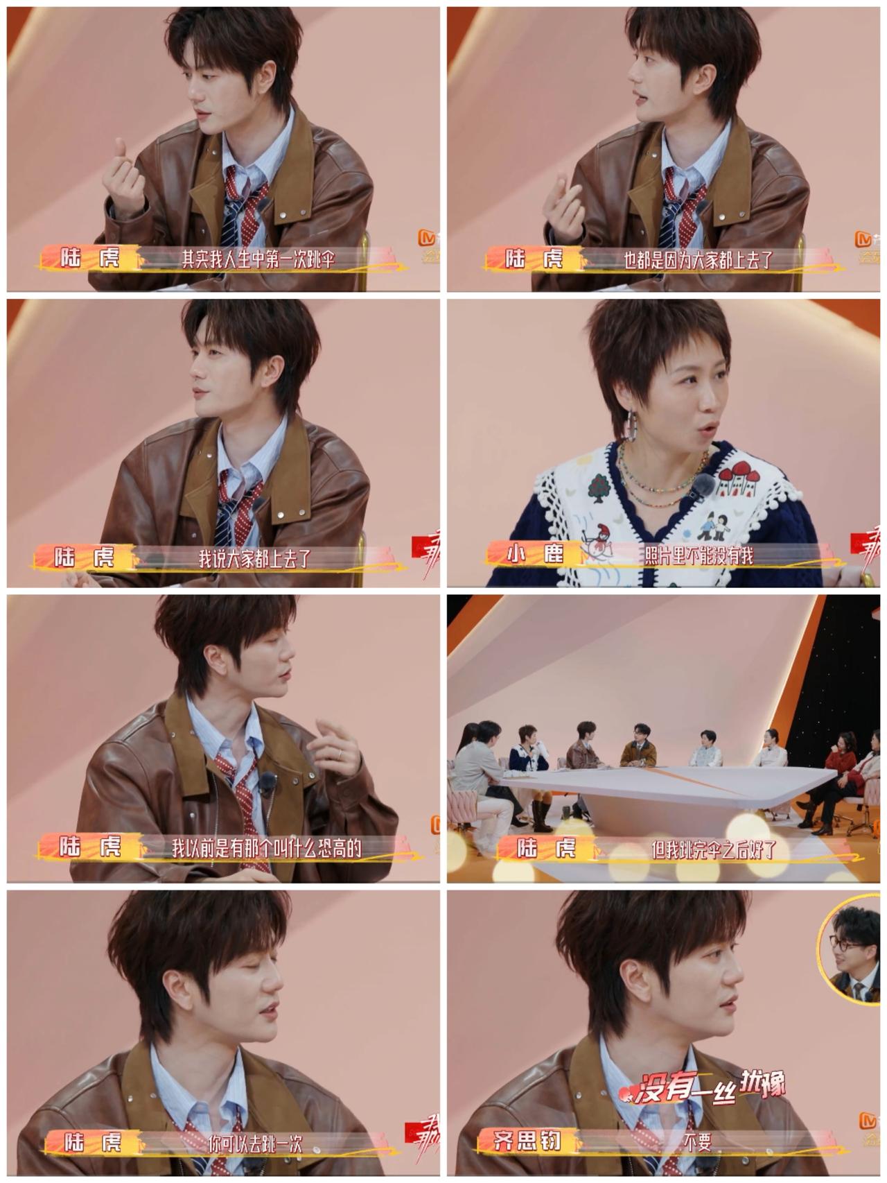 陆虎为了这样一个“荒唐”理由, 硬着头皮去做, 下一刻 他就有点后悔了。 陆虎本身是恐高的, 但是陈楚生他们都上去跳伞了, 陆虎本想退缩的。 但是想到在兄弟们的这个难忘回忆中 不能没有自己的身影, 于是他就硬着头皮上去了。 哎呀, 陆虎就是这样为了兄弟“上天入地”的人, 也许陆虎也是像张晚意那样的人, 张晚本身对于某件事不是很抗拒, 就是没有勇气去做, 需要别人去推一推, 于是在龚俊的“怂恿”下, 张晚意尝试了滑翔机。 这样看来陆虎不是真的恐高, 只是需要一些勇气而已, 在兄弟的鼓励下, 就不顾一切, 一鼓作气尝试了第一次跳伞, 从此以后都不恐高了。 你看齐思钧是真的恐高, 无论陆虎如何劝说, 他断言拒绝, 一点都不带犹豫的。