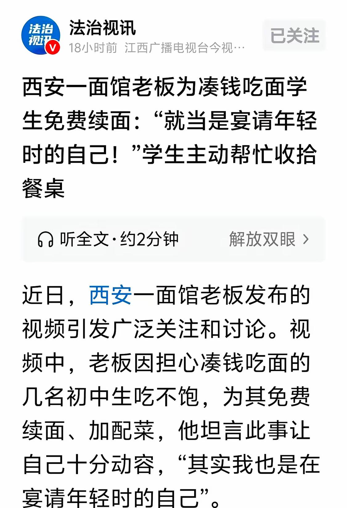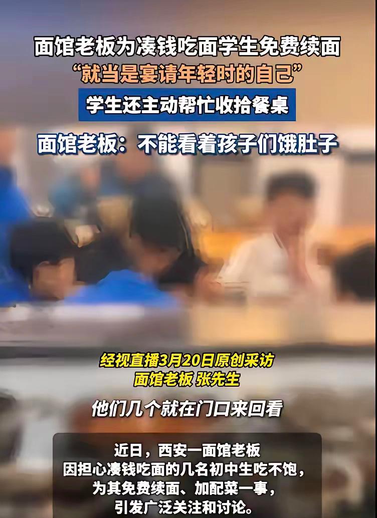 活该老板发财!陕西西安,3名初中生来吃面,只点了一份爆肚面,3个人合吃,老板看不下去,担心孩子们吃不饱,免费给他们续了面。3人觉得好吃,又叫好几个同学一块来吃,老板一点没怠慢,给孩子们免费续了8份面,还单加了配菜,学生们知道感恩,主动帮老板收拾了餐桌。网友:相比加半勺葱花要收费的面馆,活该这老板发财! 3月13号中午,三个初中生在一家面馆前来回转悠,低着头数手里的零钱。一块的,五毛的,凑来凑去。老板张磊在店里看见了,他掀开门帘喊:“别在外头站着,先进来看看想吃啥。” 孩子们红着脸进来,只要了一碗十八块的招牌爆肚面。点单时还特意小声说:“叔叔,面少放点。”这话让张磊更纳闷了。等面端上去,他明白了。三个脑袋凑在一个大碗前,你一口我一口,分着吃。 张磊转身进了后厨。再出来时,手里端着三大碗刚煮好的面,还有双份的牛肚和青菜。孩子们慌得直摆手。张磊笑了:“我开店不是做慈善,但也不能让你们饿着肚子走。”他今年三十二岁,也是个“95后”。看着这些孩子,就像看见二十年前的自己。那会儿家里条件不好,他也常和同学凑五毛钱,分一碗臊子面。 让张磊没想到的是,这三个孩子吃完没走。他们跑到店外,又叫来了七个同学。十来个半大孩子,围坐在长桌前。张磊又续了八碗面,后厨的配菜都加光了。孩子们吃得开心,张磊心里更暖。他说,给孩子们免费续面,就当是宴请了当年那个窘迫的自己。这话不煽情,却扎扎实实打动了很多人。 吃完面几个孩子主动站起来,收拾碗筷,擦桌子,动作很麻利。视频在网上火了之后,他们还在评论区认真留言:“叔叔的面馆在XX路,爆肚面超好吃!”用自己稚嫩的方式,回报这份善意。 面馆一下子成了网红店,不少人开车几十公里过来,就为吃一碗“暖心面”。有人偷偷多付钱,被张磊退了回去。他说,我做的是生意,不是爱心募捐。该多少钱就多少钱。 一碗面十八块,利润本来就不厚。免费续八碗面,再加配菜,这单生意肯定是亏的。但张磊觉得值。他保护了孩子们脆弱的自尊心,没让他们因为“穷”而难堪。这份体贴,比面本身更珍贵。 在这个精于计算的时代,很多人做生意,恨不能一颗葱花都标上价。张磊却用最笨的方法,守住了生意人最该有的温度。他给的不仅是面,是一份“被看见”的尊重。孩子们还的也不仅是帮忙,是一颗“懂得感恩”的真心。 善良遇见懂得,温暖就有了回声。这大概就是最好的生意经,也是最朴素的人生道理。店门口“免费续面”的招牌一直挂着,但比招牌更亮的,是老板心里那盏没灭的灯。 各位读者你们怎么看?欢迎在评论区讨论。
