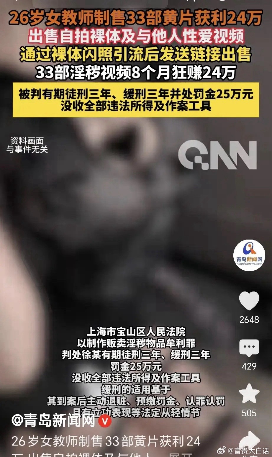想钱想疯了?女教师8个月卖淫秽视频狂赚24万,判了!