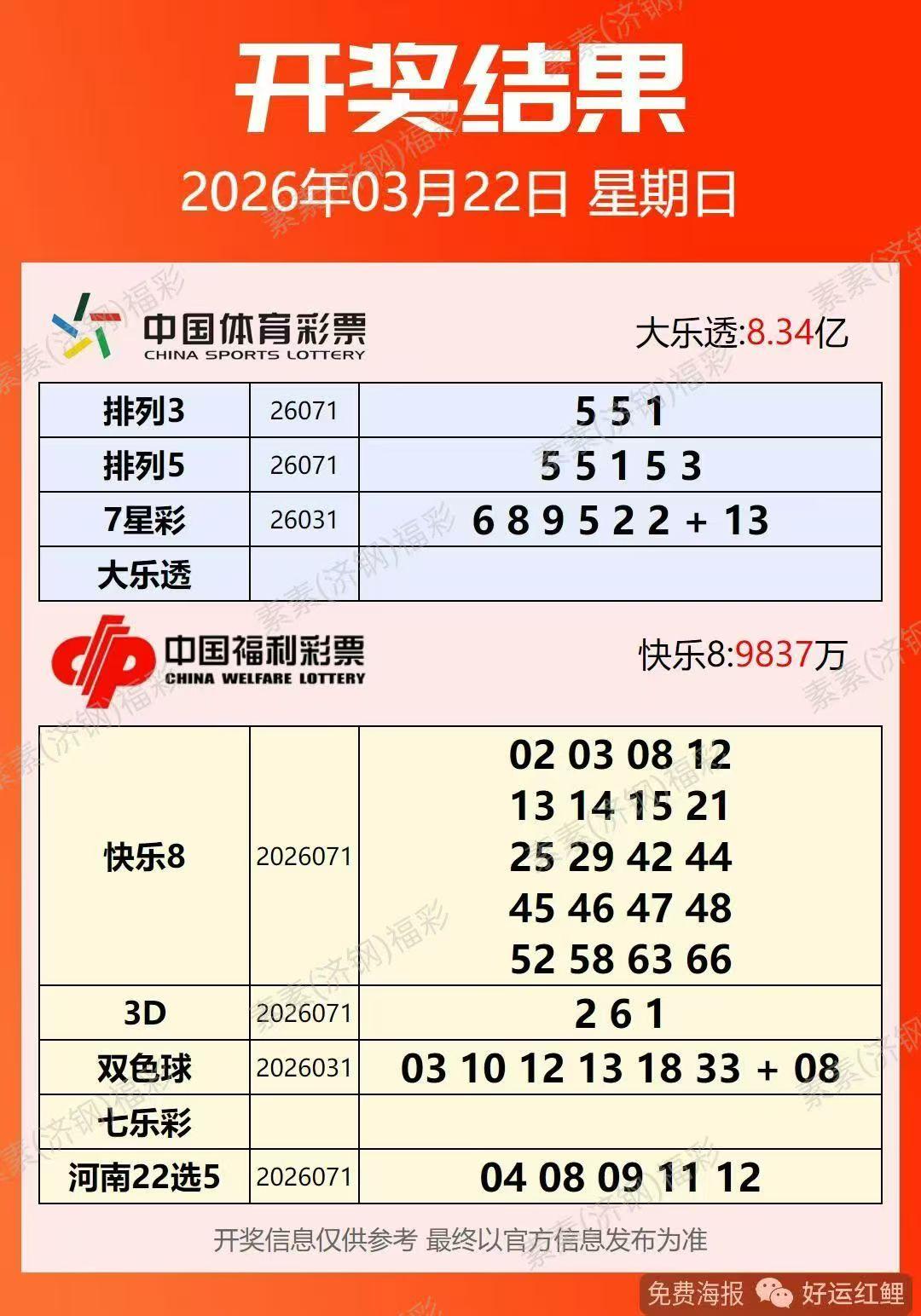 3月22号星期日,双色球开奖号码揭晓:03、10、12、13、18、33—08。本期双色球开奖号码前区红球开出了一枚重号10号,开出了一组连号12、13号,开出了一组十进制同尾号03、13、33号,后区蓝球开出了间隔十几期的热号08号。 本期双色球开奖号码前区红球大中小区号码都有分布比较均匀。一等奖开出10注,单注奖金540万元。一等奖中奖分布情况:北京江苏广东江西深圳各中得一注,四川中得两注,浙江中得三注。