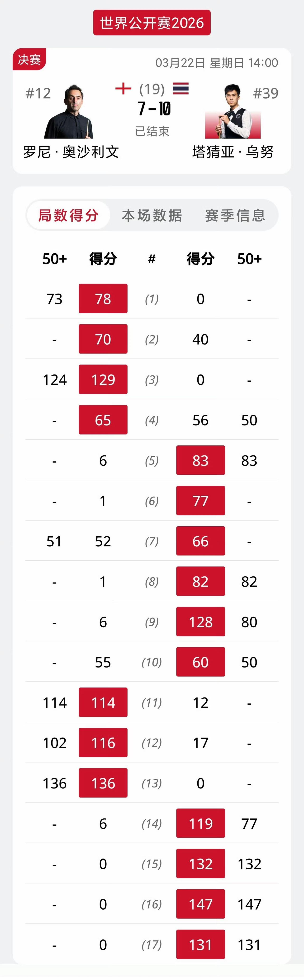 斯诺克真是疯狂!塔猜亚决赛对阵火箭打出的这杆满分147竟然拿不到单杆最高分奖金。 两人最后7局这数据……简直疯了!还以为奥沙利文第42冠板上钉钉,塔猜亚最后4局能打出这样的数据,也是神!