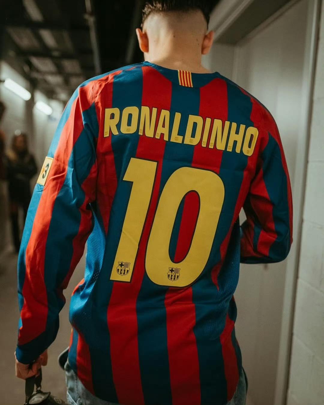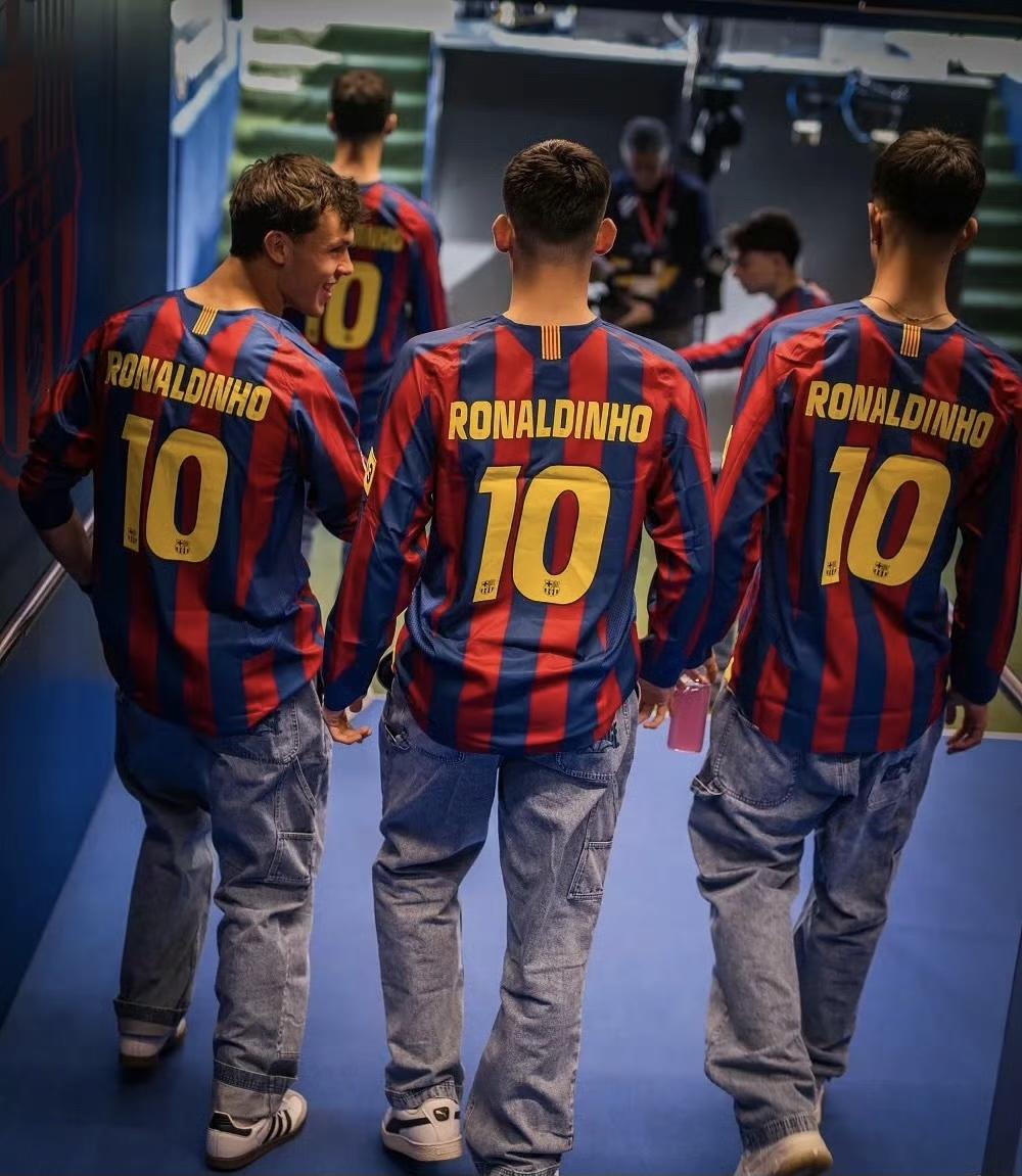 对阵巴列卡诺赛前,巴塞罗那球员身穿2005/06赛季罗纳尔迪尼奥的10号经典球衣,进行踩场热身。那个赛季,小罗带领巴塞罗那夺得欧冠冠军。 俱乐部以此方式,对球队传奇致敬,也为这位“足球精灵”送上46岁生日祝福。