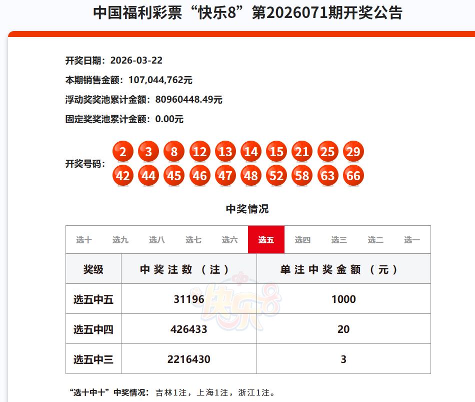今晚被快乐8的开奖结果震惊了! 快乐8选五中五大爆31196注,固定奖奖池再次被清空,这个结果属实令人意外。平时该玩法一般中出10000多注,多的时候也就15000注左右,今晚能够中出30000多注,估计又有多倍投踩狗屎运了。 而选十中十也中出3注一等奖,单注奖金500万,被吉林、上海、浙江三地彩民摘得。不仅如此,从中奖结果上来看,选九、选八等等,几乎是所有玩法全爆奖了。出现这种情况还是比较少见的。