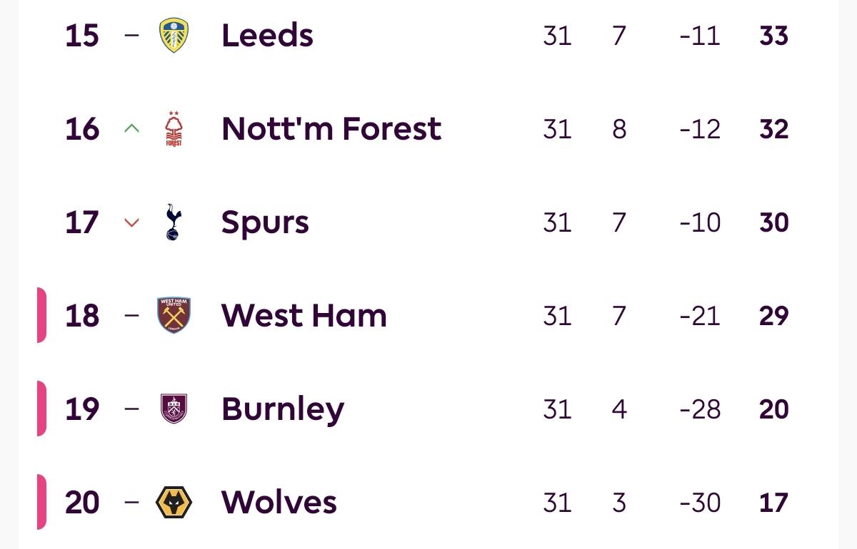 【热刺输掉保级六分战】英超第31轮焦点战,热刺主场0-3完败于诺丁汉森林,输掉了这场关键的保级六分战!进入2026年,热刺依然无法在英超联赛获胜。 幸运的是,另一边,维拉主场2-0拿下西汉姆联,热刺得以侥幸地留在降级区外。 目前,诺丁汉森林积32分排在第16,热刺积30分排在第17,西汉姆联29分排在第18(详见图3)。热刺正一步步滑向降级深渊。热刺