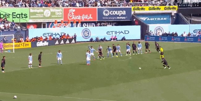 还得是梅西!!!任意球扳平!!!2比2!!!!射门距离很远!但梅西选择了出其不意的弹地!门将被骗掉重心,无法阻止皮球入网!!!!纽约城vs迈阿密国际 梅西任意球破门