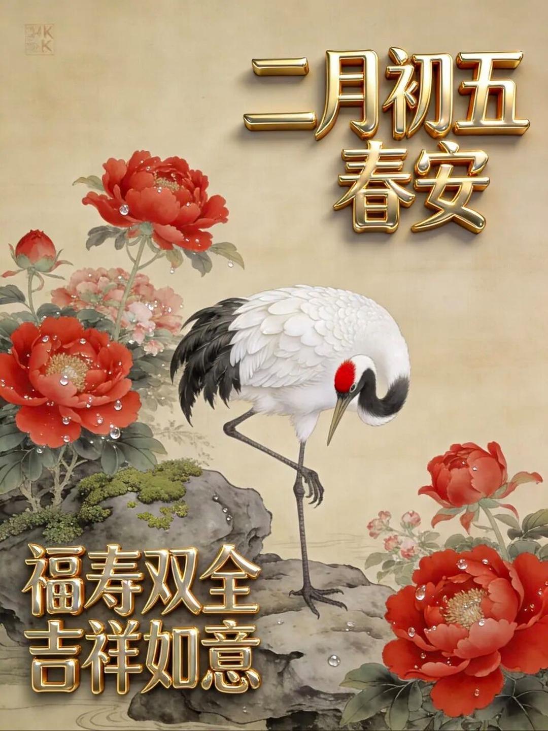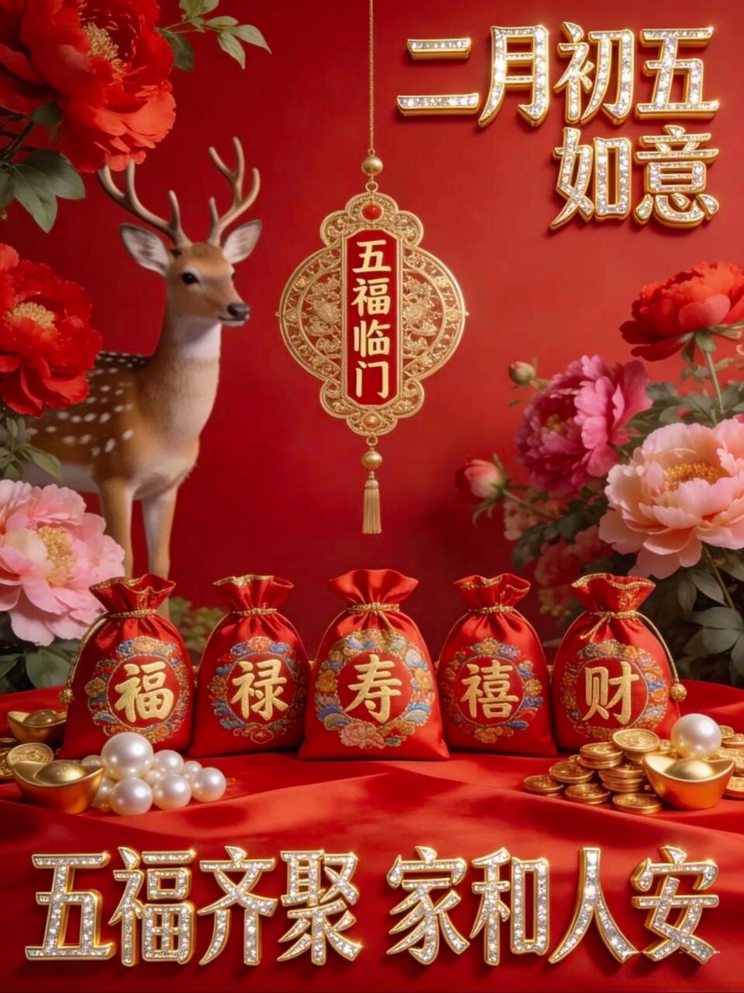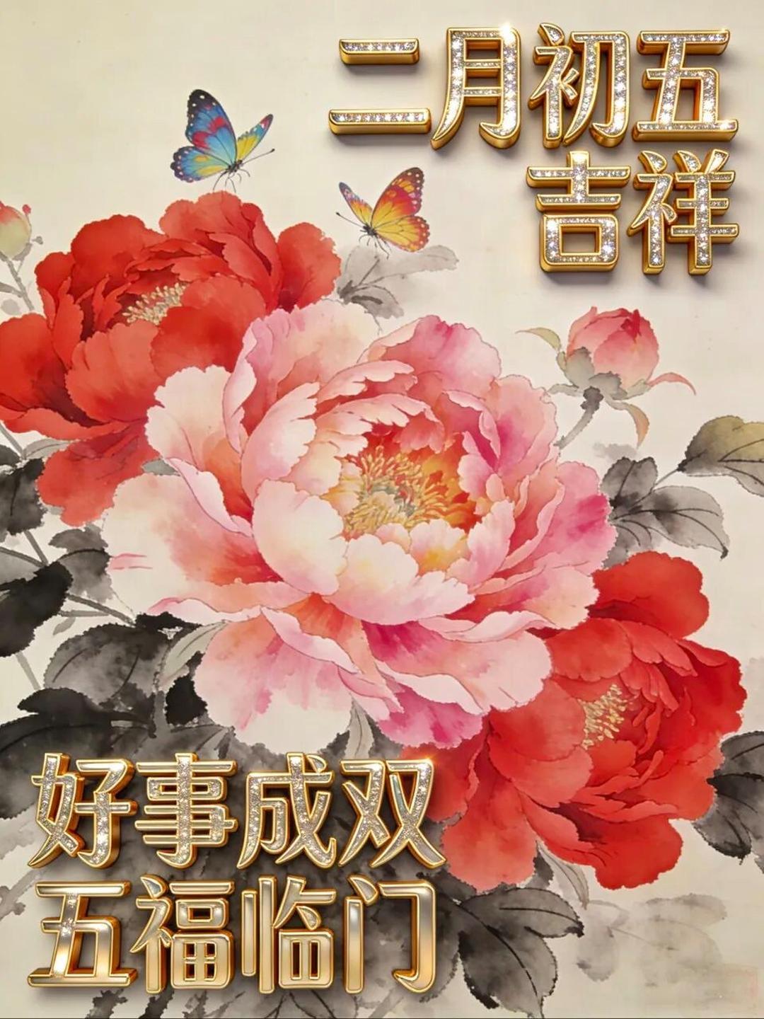 二月初五,五福临门,好运相随。愿你福星高照,五谷丰登,金玉满堂,日子甜蜜,喜乐常