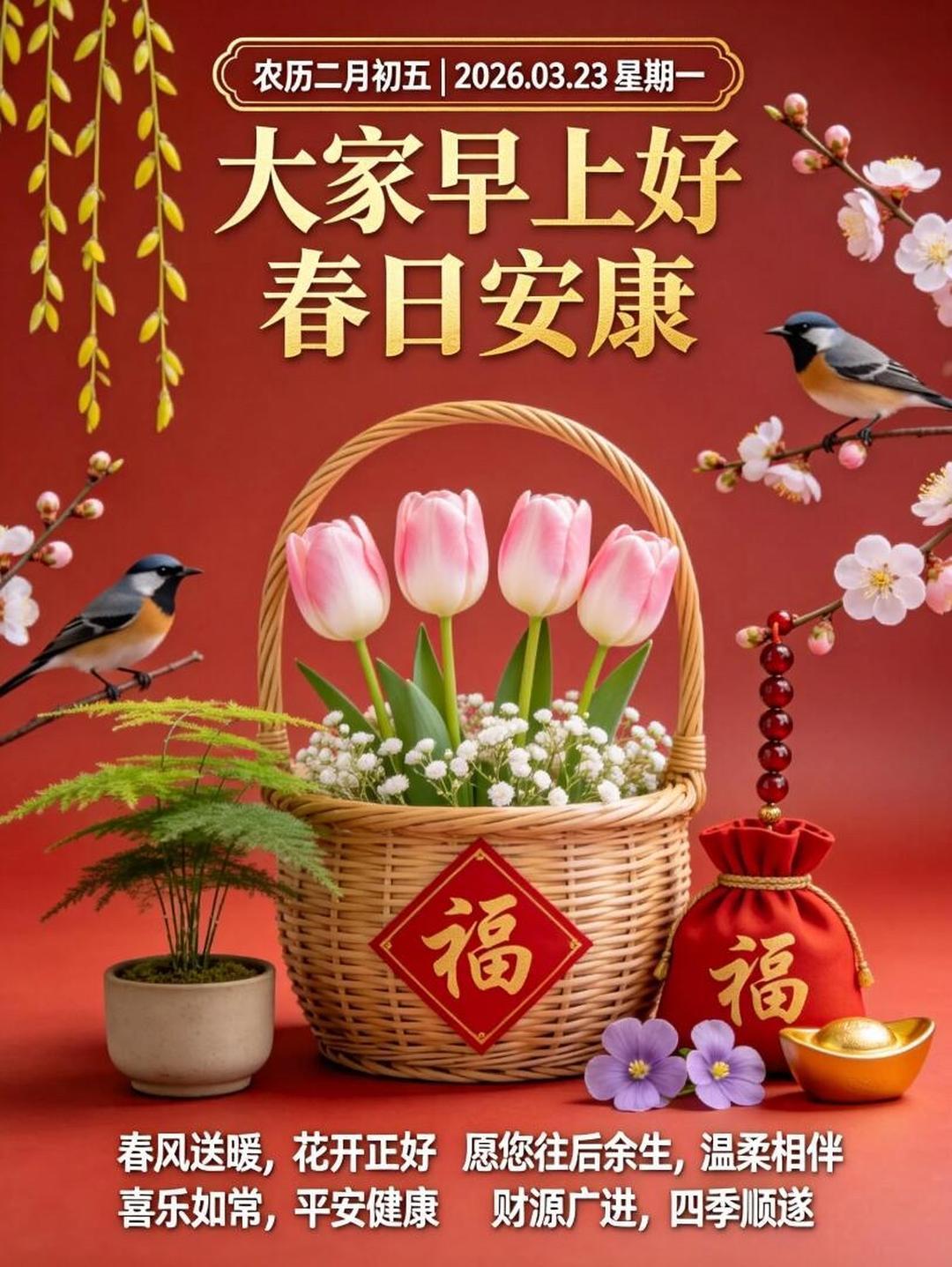二月初五,五福临门,好运相随。愿你福星高照,五谷丰登,金玉满堂,日子甜蜜,喜乐常伴。早安吉祥!🌞🌾💰🌸传统文化 早安