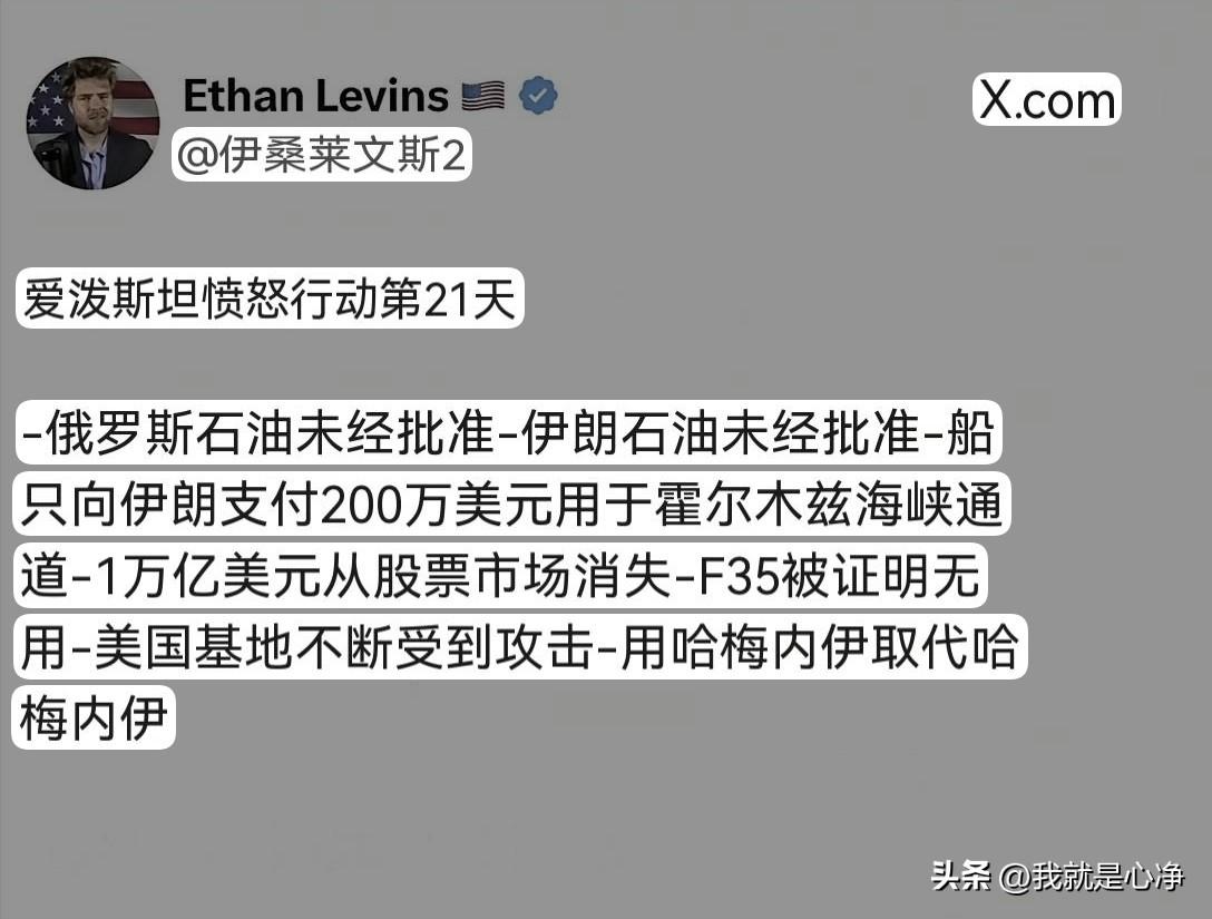 谁说美国网友全都是快乐教育啊?这不也有能看明白事情的吗? 看看人家美国的网友总结的多好,你看看特朗普,挑起这场中东战争之后,达成了多少战果吧? 第1条,俄罗斯和伊朗的石油居然从被制裁状态变成了解封状态 第2条,伊朗公开向那些通过霍尔木兹海峡的船只收取200万美元的通行费 第3条,美国大概10,000亿美元的财富从资本市场上消失 第4条, F35战斗机也被击中了 第5条,美国在中东的基地接连被攻击 第6条最可笑,特朗普用一个哈梅内伊取代了之前的哈梅内伊 这就是20多天的战争,特朗普带给全世界的战果 其实他还少说了一条,伊朗现在连4000多公里的导弹都变出来了 欧洲此刻也都不安全了,这些欧洲盟友们,真的要感谢特朗普八辈的祖宗啊!