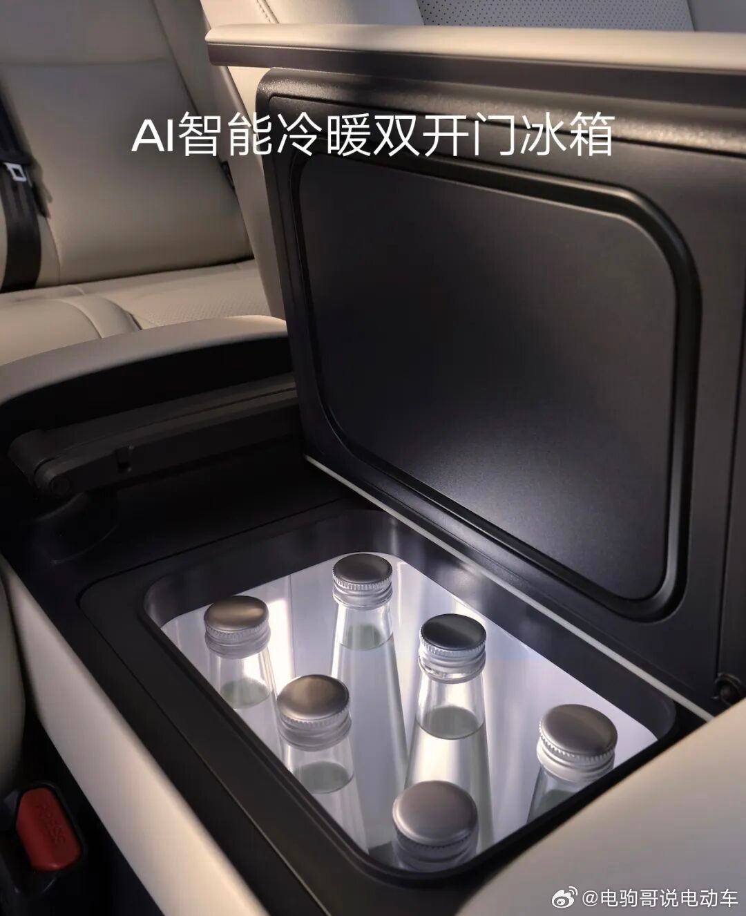 前排搭载了双联屏,车内配有6.33升双开门AI智能冷暖冰箱,支持-6℃至55℃宽温域调节,