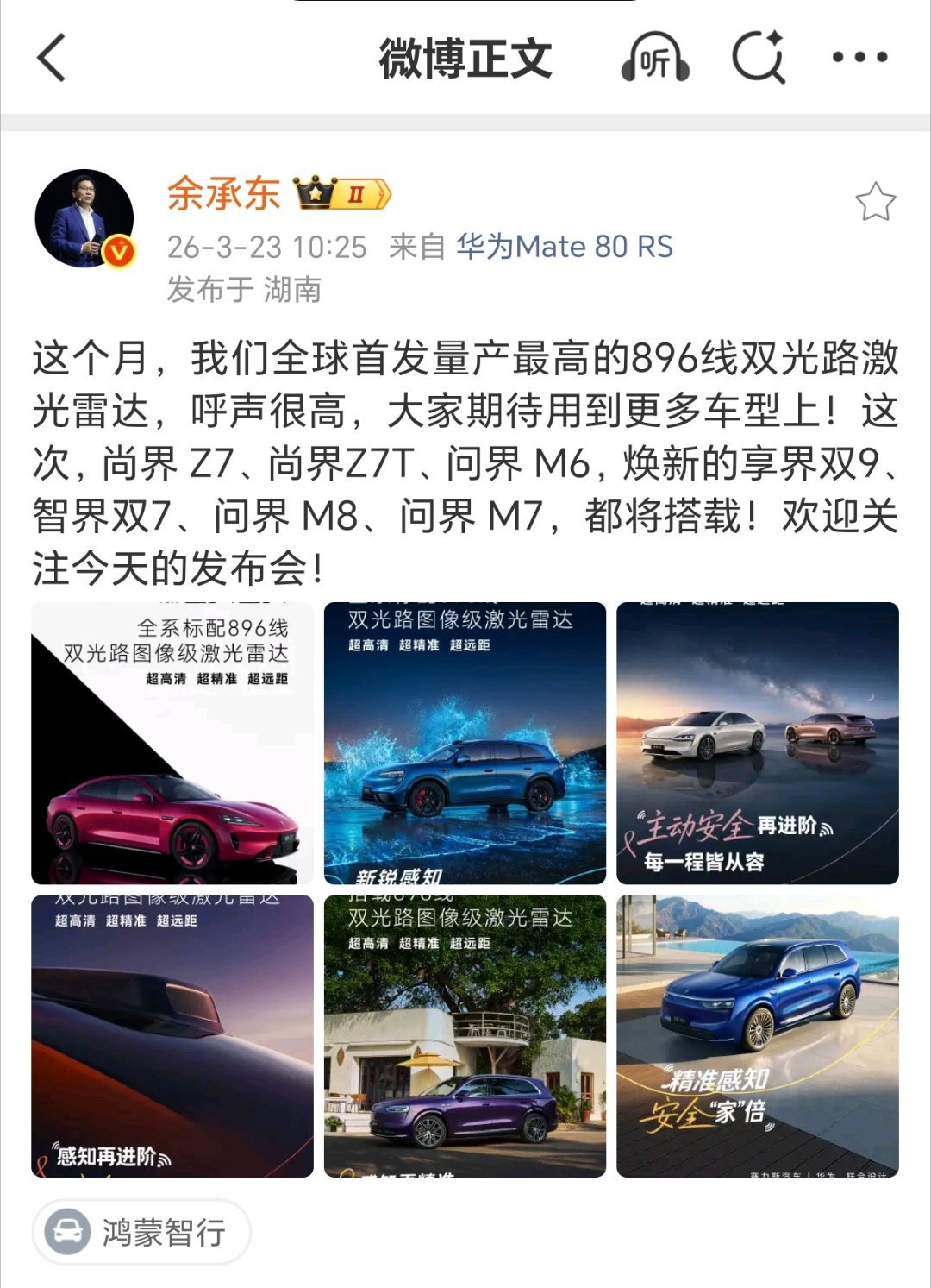 华为余承东在微博发文宣布:这个月,我们全球首发量产最高的 896 线双光路激光雷达,呼声很高,大家期待用到更多车型上!这次,尚界 Z7、尚界 Z7T、问界 M6,焕新的享界双 9、智界双 7、问界 M8、问界 M7,都将搭载。
