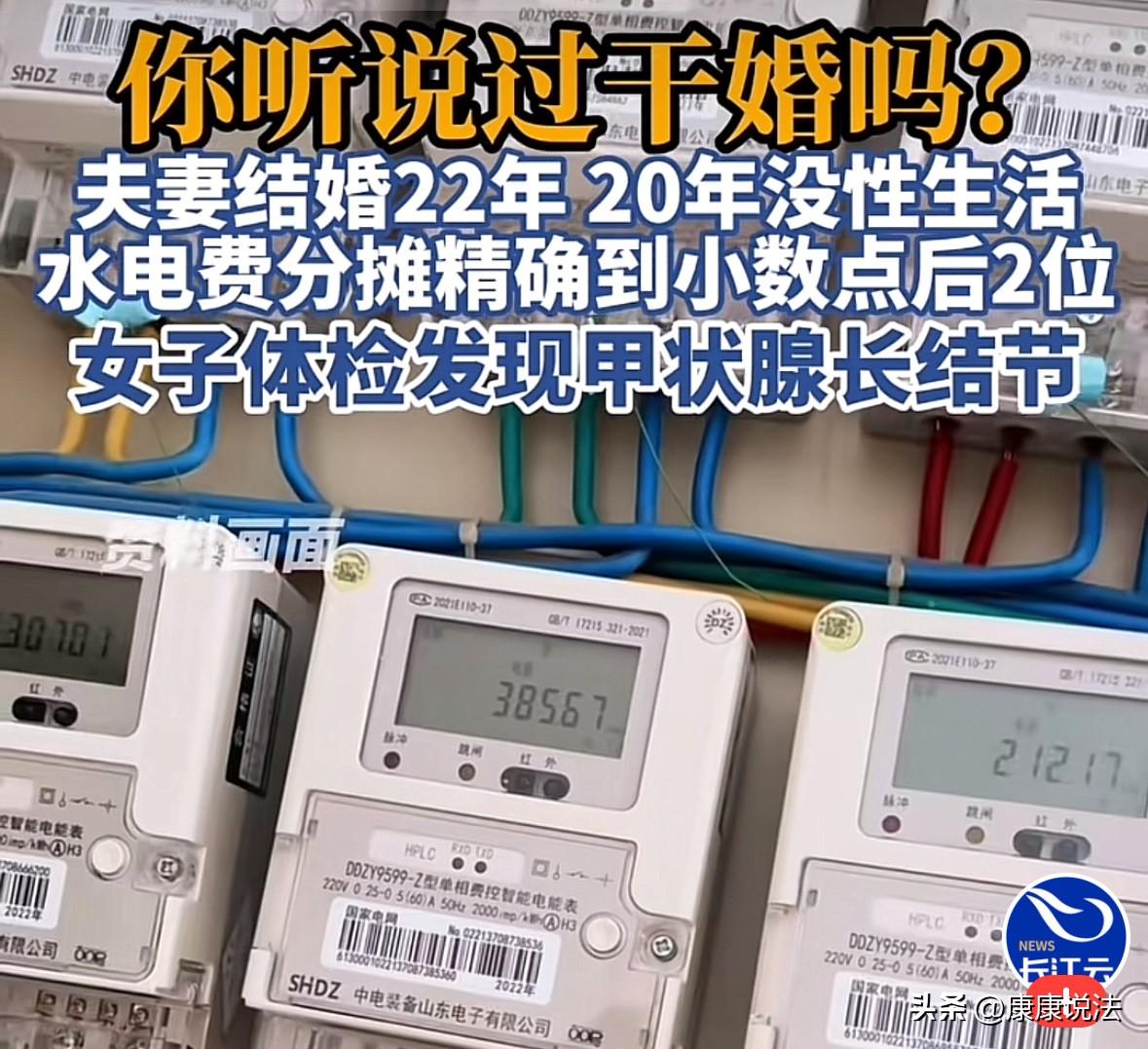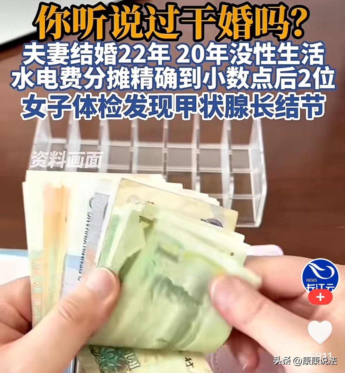 憋出病了吧!一女子结婚22年,仅前两年和丈夫过夫妻生活,往后20年两人一直各睡各的,窝在50平的小房子里零交流,就连水电费也是平摊,甚至会精确到小数点后两位。直到女子身体不适,查出甲状腺长出多个结节,才下定决心离婚! “干婚”这个词,在很早以前就有了,是指挂名的婚姻,仅维持名义或形式上的婚姻,但实质上两个人互不干涉,也互不承担对彼此的义务。 有人可能会问:那结这个婚是为了个啥? 很多人对此表示不可思议,但现实生活中,这种形式的婚姻还不少。 近期,一名从业近20年的婚姻律师曝出,她曾经经手过的一个离婚案例。 男子和女子当初到了适婚年纪,然后经亲戚朋友介绍,认识了彼此。 两人刚开始交往那阵子,觉得彼此都还可以,有话聊,是尚可的结婚对象。 于是,交往了一阵子,两人很快就步入了婚姻殿堂。 刚结婚那会儿,他们也像其他新婚夫妇一样,甜蜜而温馨。两人平日里都会为对方操心,照顾彼此的生活。 一起早起上班,下班回家一起做饭,周末有空了,还会一起去看个电影,逛个公园,夜里两人也会相拥而眠。 他们还经常分享一些生活中或者职场上的趣事,小日子过得恬淡而幸福。 然而,好景不长,随着时间的推移,生活的琐碎渐渐消磨了他们之间的激情与温情,两人开始渐行渐远。 不知从何时起,两人不再同床共枕,开启了分房睡的生活模式,没有了如胶似漆,也没有了耳鬓厮磨,剩下的只是冷漠。 同在一个屋檐下,日子却过得静默无声,一点烟火气都没有。 在旁人看来,他俩更像是好邻居,好的合租伙伴。 下班后,两人各自回屋,做饭也只做自己的,冰箱也划分了区域,各自使用各自的区域。 就连家里的水电费,两人也坚持AA制,每一笔开销都计算得清清楚楚,甚至会精确到小数点后两位。 恐怖的是,这样的日子,一过就是二十年。 二十年间,两人生活在同一屋檐,但几乎没有任何交集。 女子偶尔会在夜深人静时,坐在床边黯然伤神,心中会涌起一股难以言喻的孤独与失落。但她总是默默地告诉自己,这就是生活,平淡如水,波澜不惊。 有时有了离婚的年头,她也会劝自己,一把年纪了,折腾啥,也不怕别人笑话。 就这样,在一次又一次的自我妥协和自我劝退中,她熬到了今天。 一次,女子在单位组织的体检中,被查出甲状腺上长出了多个结节。 众所周知,甲状腺长结节,十有八九是因为情绪不好,压力太大,爱生气导致的。也就是说,女子这20年,硬生生把自己憋出了病。 女子这才意识到,比起别人的看法,自己的健康才是重要的,她还想健康的活在这世上,她还有很多事情没有做,很多风景没有欣赏。 于是,她勇敢的做了个决定,与其在这种冷漠的婚姻里彼此煎熬,不如痛痛快快的各自安好。 她决定,要为自己活一次,结束这段名存实亡的婚姻。 当她提出离婚时,丈夫在虽然犹豫了两天,但最终还是决定,放过彼此,各自安好。 《民法典》第1079条规定:夫妻一方要求离婚,可直接起诉;法院审理应先调解,感情确已破裂、调解无效,应准予离婚。 女子最终在健康的警钟下,恍然醒悟,因为在意别人怎么看而牺牲自己的快乐,去保全一段完整的婚姻,是极其愚蠢的行为。 人生在世,自己的感受才是真实的,忠于自己,才会拥有你想要的。 对此,你怎么看!